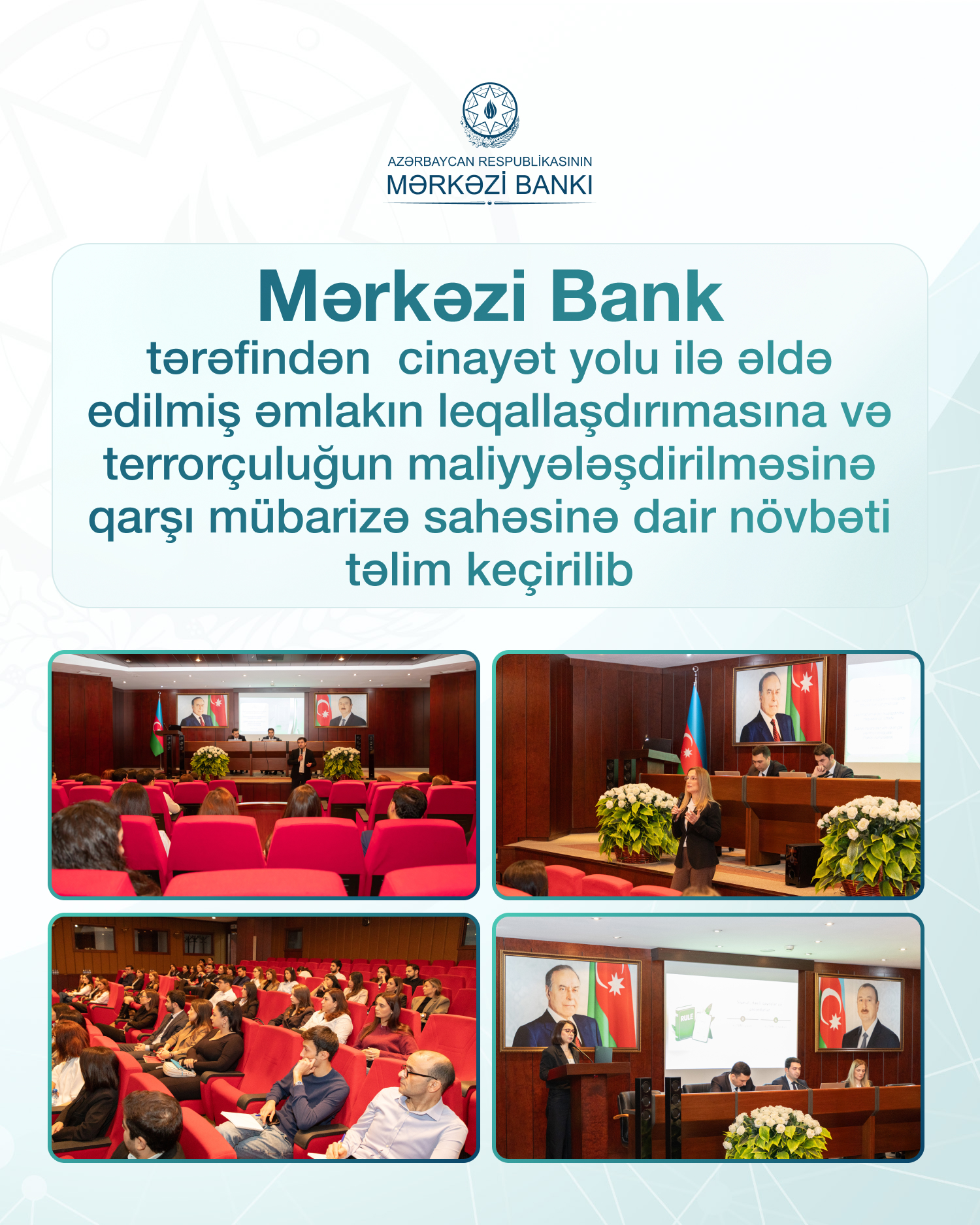 Mərkəzi Bank tərəfindən banklar və poçt rabitəsinin milli operatorunun nümayəndələri üçün cinayət yolu ilə əldə edilmiş əmlakın leqallaşdırımasına və terrorçuluğun maliyyələşdirilməsinə qarşı mübarizə (ƏL/TMM) sahəsinə dair növbəti təlim keçirilib.