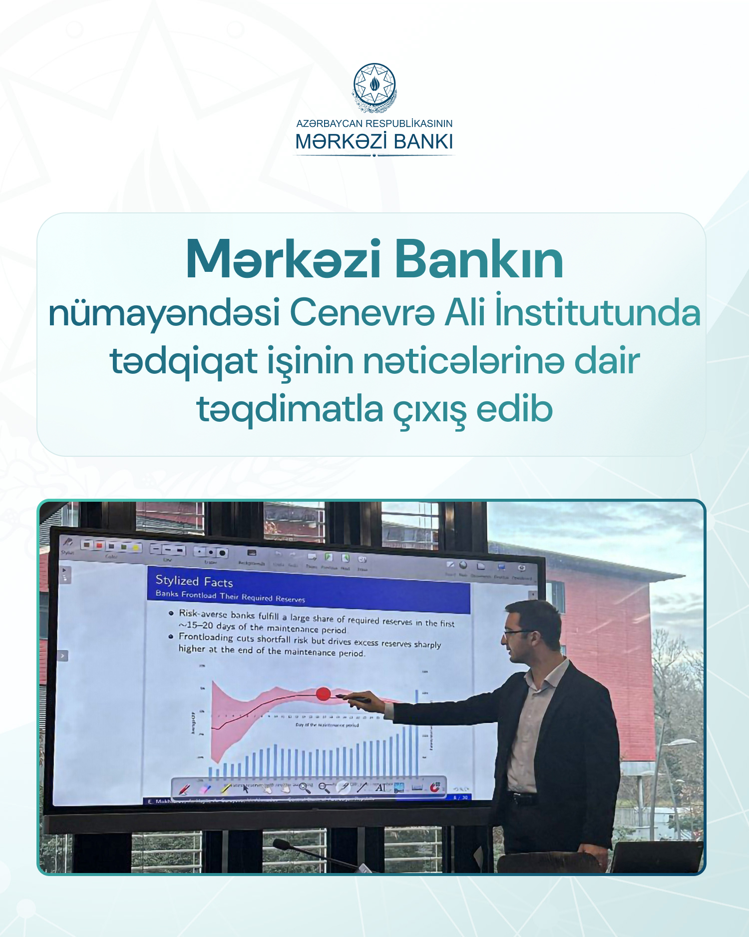 Finss.az AMB-nin məlumatına əəsasən xəbər verir ki, tədqiqat layihəsi “Təminatsız banklararası bazarda faiz dərəcələrinin ehtiyatların saxlanma dövrü ərzində likvidlik şəraitinə həssaslığı” mövzusuna həsr olunub. Proqram çərçivəsində elmi tədqiqat işinin müəlliflərindən olan Mərkəzi Bankın baş direktoru Vüqar Əhmədov, Tədqiqatlar departamentinin əməkdaşları Aygün Qarayeva , Elmir Muxtarov və Əli Hacılı cari ildə 3 ay ərzində xarici ekspertlə birgə çalışıb. Proqramın yekun mərhələsi olaraq Mərkəzi Bankın Tədqiqatlar departamentinin əməkdaşı Elmir Muxtarov tədqiqatın əsas nəticələri barədə Cenevrə Ali İnstitutunda beynəlxalq auditoriya qarşısında təqdimatla çıxış edib. O, tədqiqatın metodologiyası, empirik nəticələri və praktik əhəmiyyətini iştirakçılarla bölüşüb, bu məsələlər ətrafında elmi müzakirələr aparıb. Tədqiqat işinin 2026-cı ilin yanvar ayının sonunadək yekunlaşdırılması və proqramın müvafiq platformasında işçi məqalələr silsiləsində yayımlanması nəzərdə tutulur.
