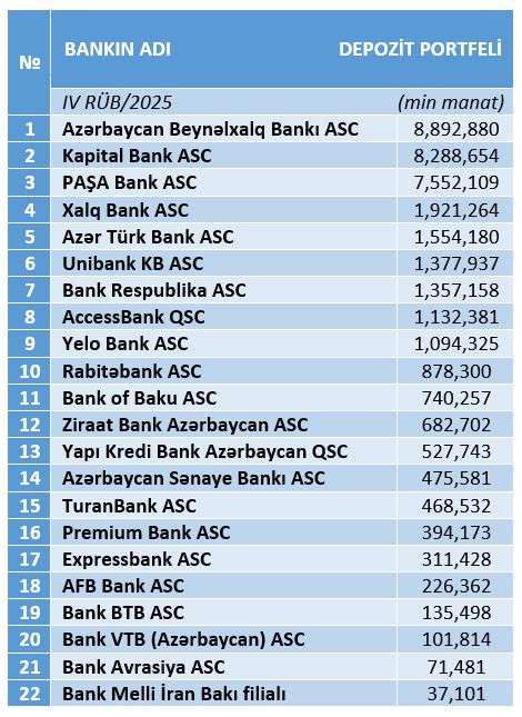 Azərbaycanda fəaliyyət göstərən bankların 2025-ci ilin IV rübünün sonuna olan depozit portfelinin həcmi üzrə cədvəli təqdim edirik: