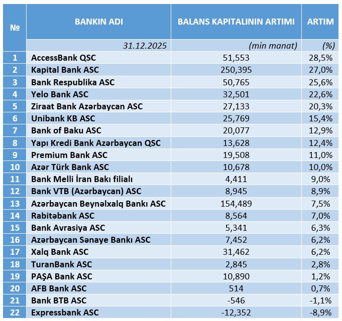Finss.az xəbər verir ki, 2025-ci ilin 4-cü rübünün sonunda ən yüksək illik artım AccessBank QSC-də qeydə alınıb – balans kapitalı 51,6 milyon manat və ya 28,5% artıb. Kapital Bank ASC 250,4 milyon manatla 27,0%, Bank Respublika ASC isə 50,8 milyon manat və 25,6% artım göstərib.