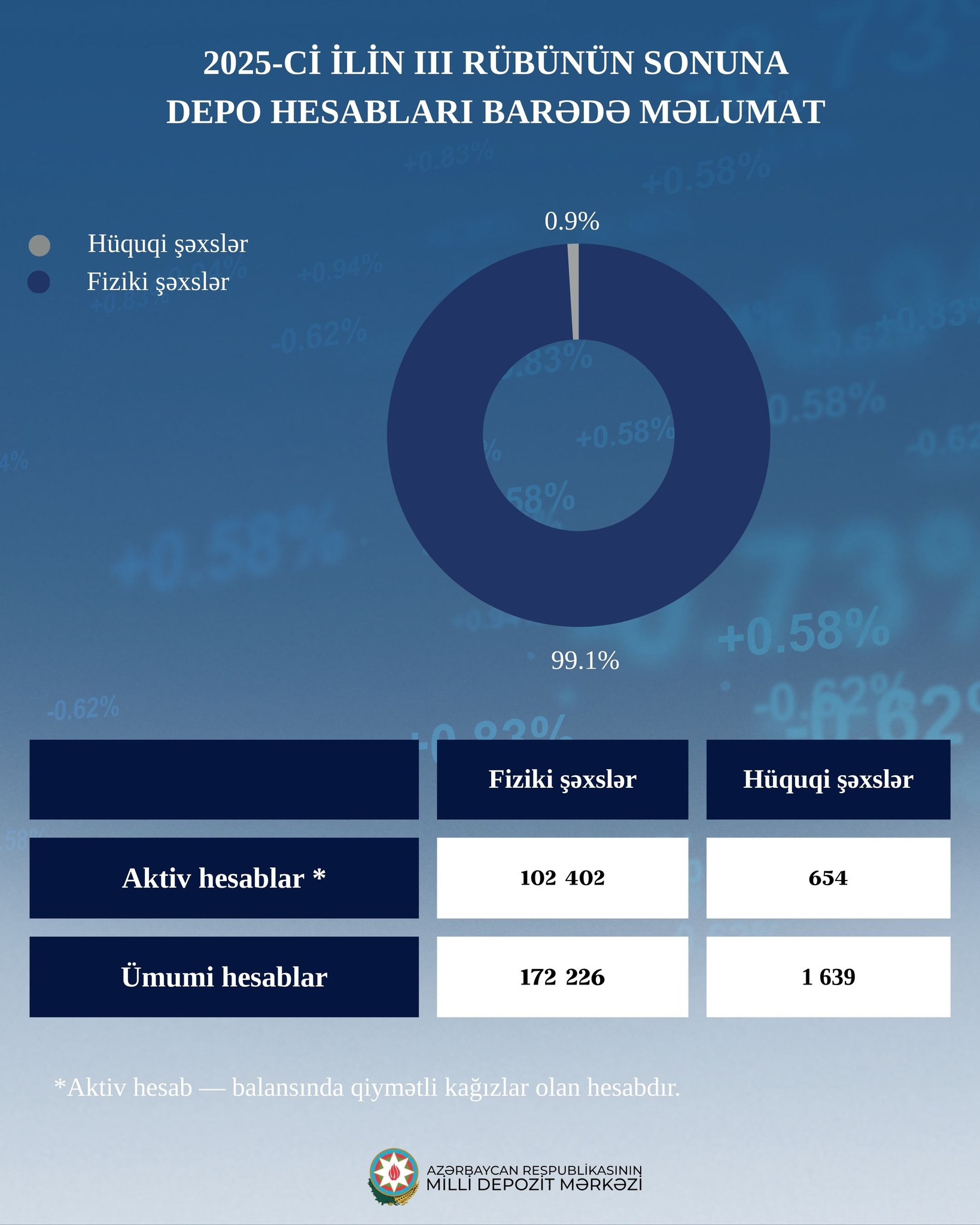 III rübün sonuna fiziki şəxslərə məxsus 172 226 depo hesabı qeydə alınıb ki, bu da ötən ilin eyni dövrü ilə müqayisədə 10,8% çoxdur. Hüquqi şəxslərə məxsus ümumi hesabların sayı isə 1 639 olub və bu göstərici 7,1% artım deməkdir.