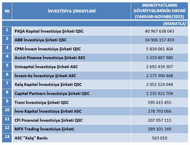 İnvestisiya şirkətlərinin əməliyyat dövriyyəsi üzrə renkinq - (Yanvar-Noyabr/2025)
