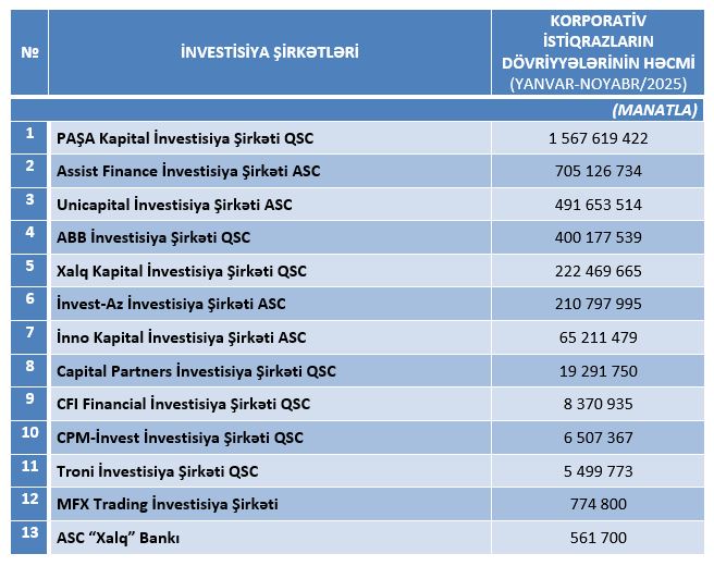Bakı Fond Birjası (BFB) 2025-ci ilin yanvar–noyabr ayları üzrə Azərbaycanda fəaliyyət göstərən investisiya şirkətlərinin korporativ istiqrazlar üzrə əməliyyat dövriyyələrini açıqlayıb.
