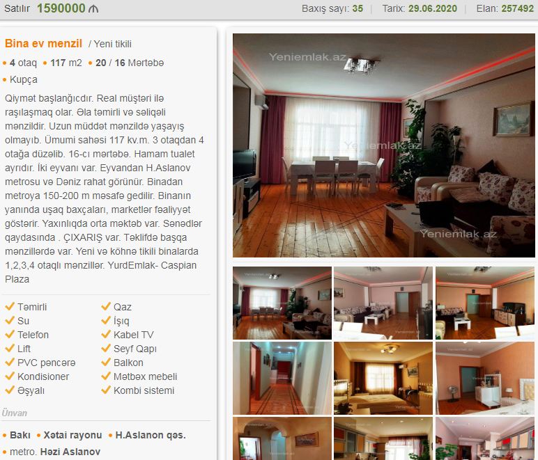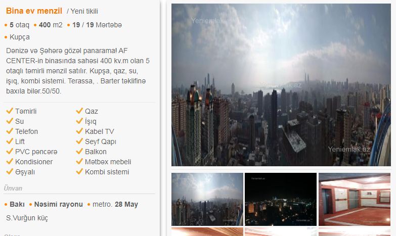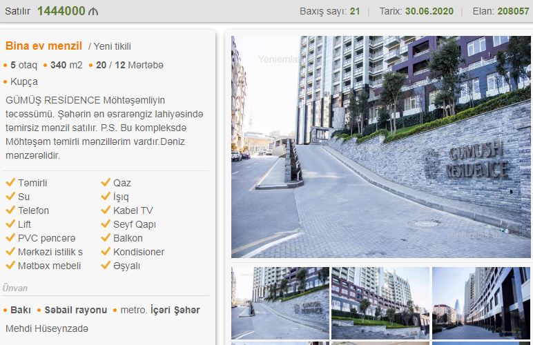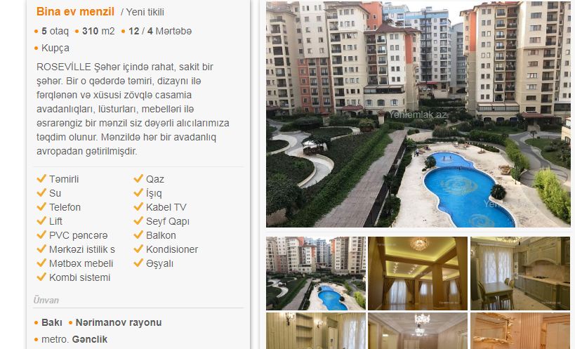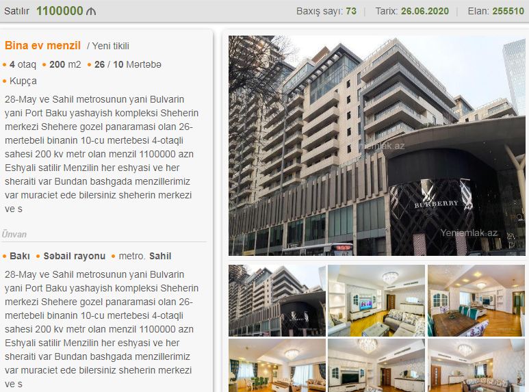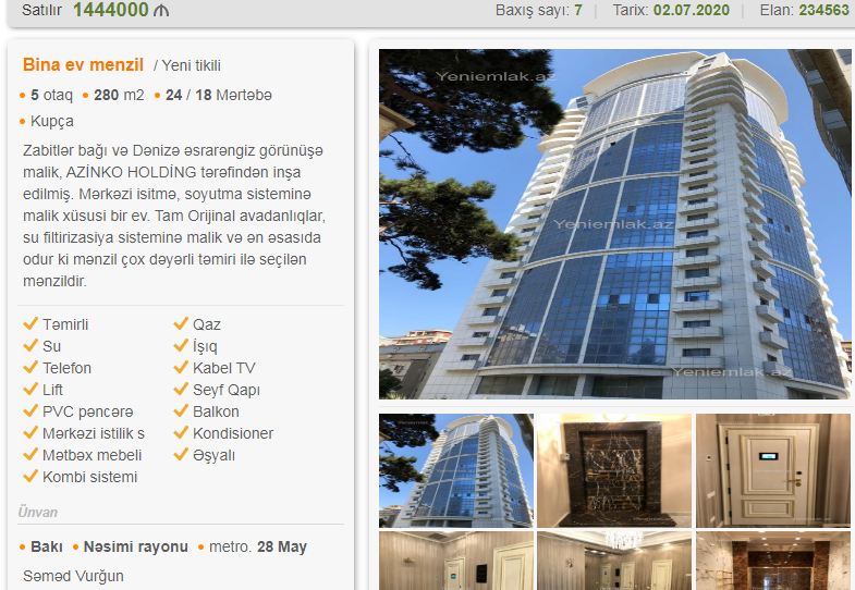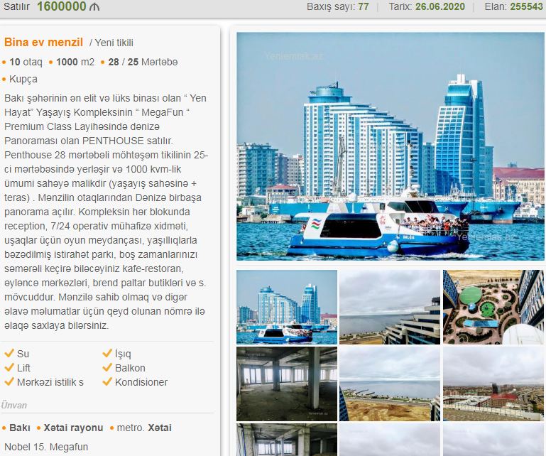 Bakıda qiyməti 1 milyon manatdan çox olan mənzillər satışdadır.