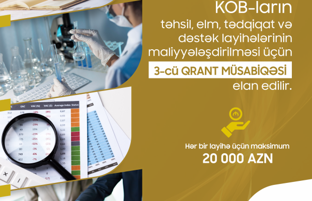 Kiçik və Orta Biznesin İnkişafı Agentliyi (KOBİA) Nazirlər Kabinetinin 30 sentyabr 2020-ci il tarixli Qərarı ilə təsdiq edilmiş “Mikro, kiçik və orta sahibkarlığın inkişafı ilə əlaqədar təhsil, elm, tədqiqat və dəstək layihələrinin maliyyələşdirilməsi Qaydası”na uyğun olaraq, təhsil, elm, tədqiqat və dəstək sahələri üzrə layihələrin maliyyələşdirilməsi məqsədilə 3-cü qrant müsabiqəsi elan edir.