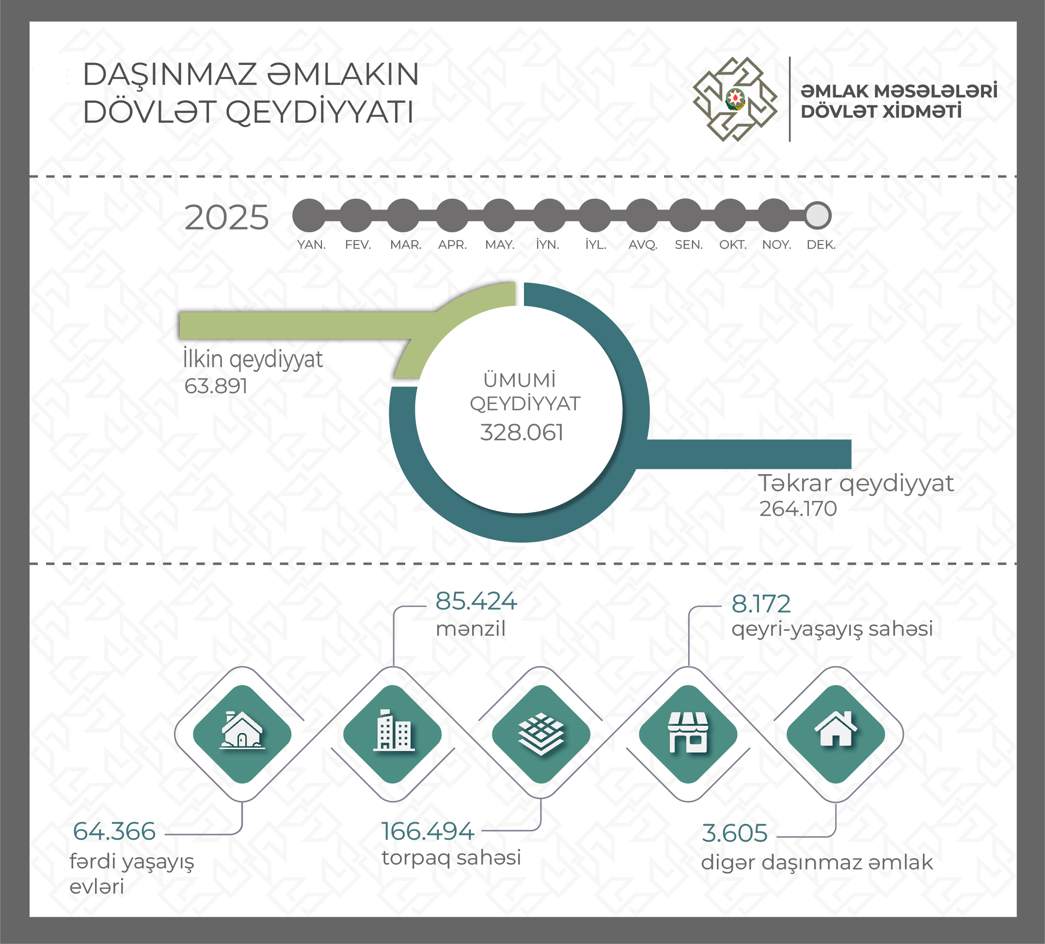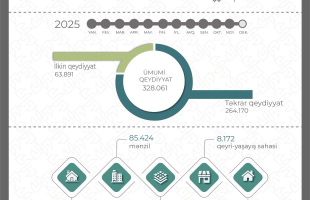 2025-ci ilin yanvar-noyabr ayları ərzində fərdi yaşayış və bağ evi üzərində – 64.366, mənzil – 85.424, torpaq sahəsi – 166.494, qeyri-yaşayış binası – 2.832, qeyri-yaşayış sahəsi – 8.172, əmlak kompleksi – 667, çoxmərtəbəli yaşayış binası – 103 və çoxillik əkmələr üzərində – 3 mülkiyyət hüququnun dövlət qeydiyyatı aparılıb. Bu dövrdə qeydiyyata alınan mülkiyyət hüquqlarının 91.917-si Bakı şəhərinin, qalan hissəsi isə bölgələrin payına düşür.