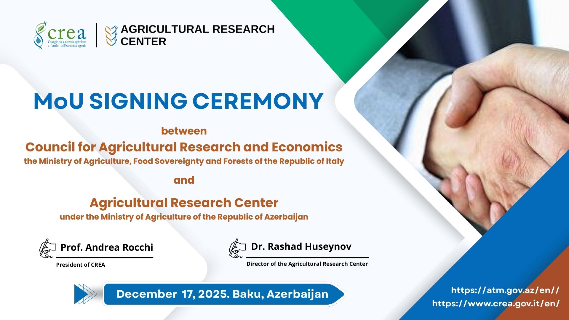 Finss.az - Azərbaycan Respublikası Kənd Təsərrüfatı Nazirliyinin tabeliyində Aqrar Tədqiqatlar Mərkəzi (ATM) və İtaliya Respublikasının Kənd Təsərrüfatı, Ərzaq Suverenliyi və Meşə Təsərrüfatı Nazirliyinin nəzarətində fəaliyyət göstərən və kənd təsərrüfatı sahəsində aparıcı tədqiqat qurumu olan Kənd Təsərrüfatı Tədqiqatları və Kənd Təsərrüfatı İqtisadiyyatı Şurası (CREA) arasında əməkdaşlıq haqqında Anlaşma Memorandumu imzalanıb. Sənədi ATM-in direktoru Rəşad Hüseynov və CREA-nın prezidenti Andrea Rocchi imzalayıb.