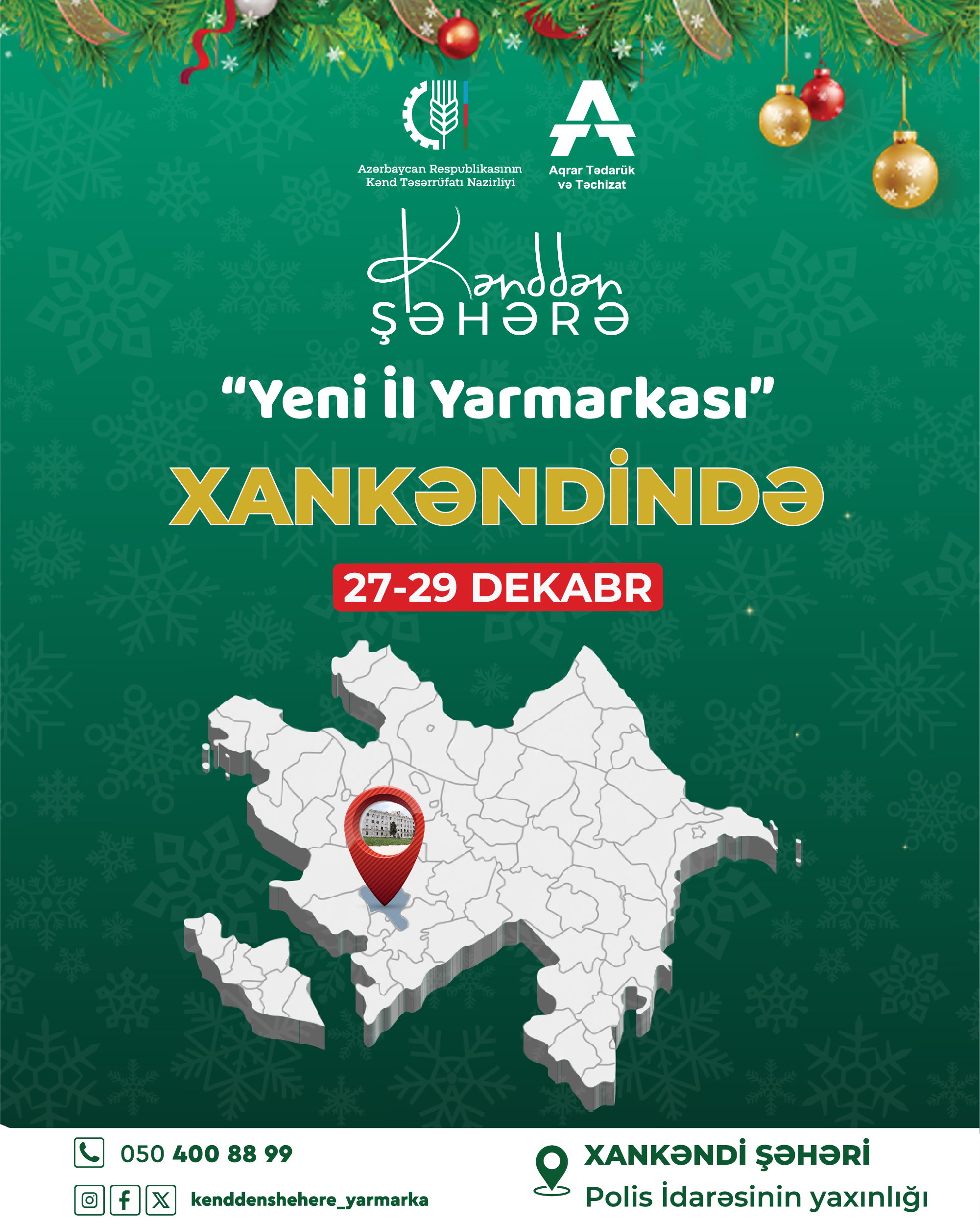 Qeyd edək ki, bu il “Aqrar Tədarük və Təchizat” ASC-nin təşkilatçılığı ilə Yeni il və Dünya Azərbaycanlılarının Həmrəyliyi Günü ərəfəsində paytaxtın 8 fərqli nöqtəsində və Sumqayıt şəhərində “Kənddən Şəhərə” Yeni il yarmarkaları fəaliyyət göstərir. “Gənclik” metro stansiyasının çıxışındakı ərazidə fəaliyyət göstərən yarmarka dekabrın 20-də açılıb, “Əhmədli”, “Xalqlar dostluğu”, “Neftçilər”, “Qara Qarayev”, “Nəriman Nərimanov”, “Elmlər Akademiyası” və “Azadlıq” metro stansiyalarının çıxışlarındakı yarmarkalar və Sumqayıt şəhərində keçmiş Şərq bazarı yaxınlığındakı yarmarka bu gündən fəaliyyətə başlayıb. “Gənclik” metrosu yaxınlığında yerləşən yarmarka dekabrın 30-dək, digər yarmarkalar isə dekabrın 29-dək alıcılara xidmət göstərəcək.