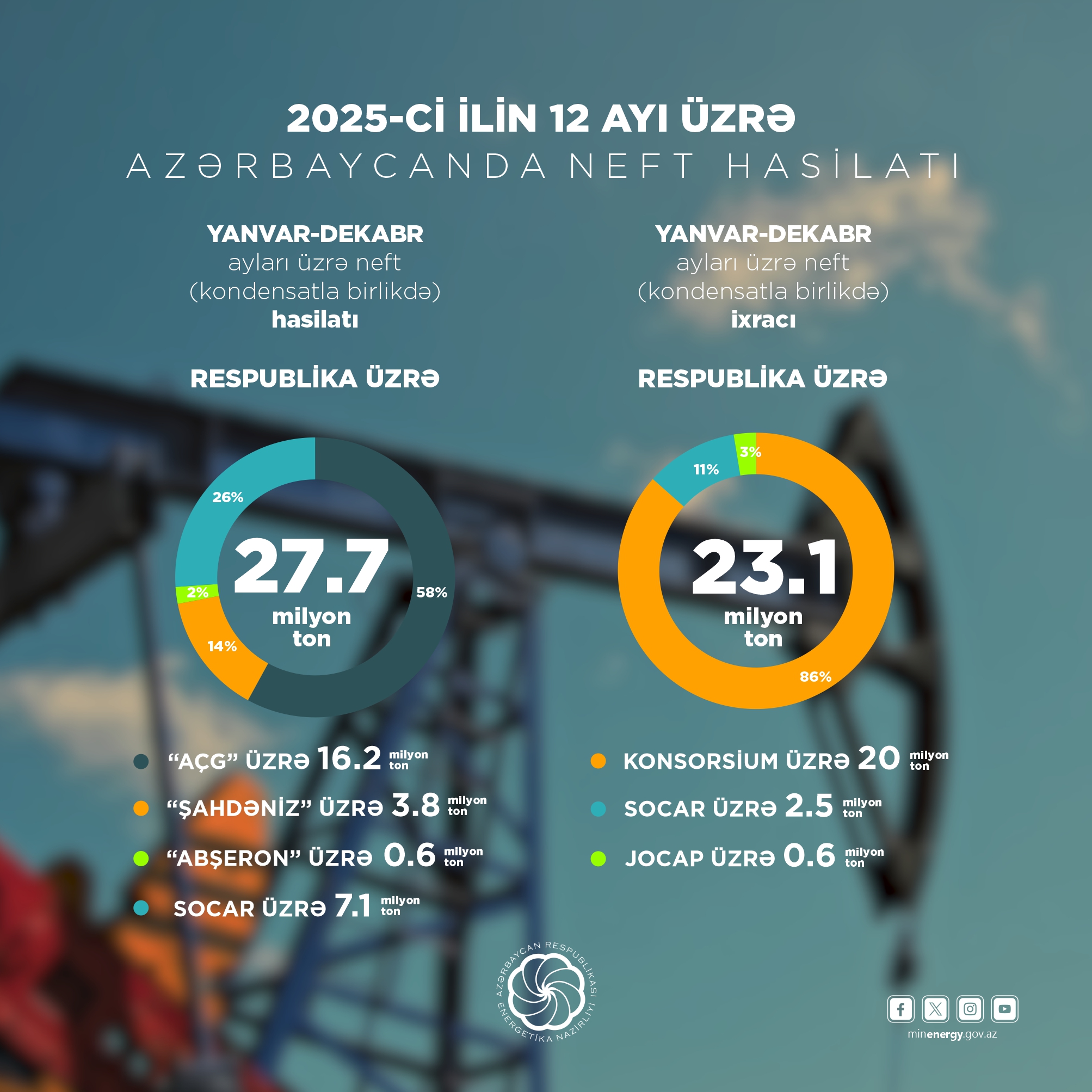 Finss.az - 2025-ci il üzrə operativ məlumatlara əsasən, respublikada 27,7 milyon ton neft (qaz kondensatı ilə birlikdə) hasil edilib. Hasilatın 16,2 milyon tonu “Azəri-Çıraq-Günəşli”nin, 3,8 milyon tonu “Şahdəniz”in, 0,6 milyon tonu “Abşeron” yatağının, 7,1 milyon tonu isə SOCAR-ın payına düşüb.