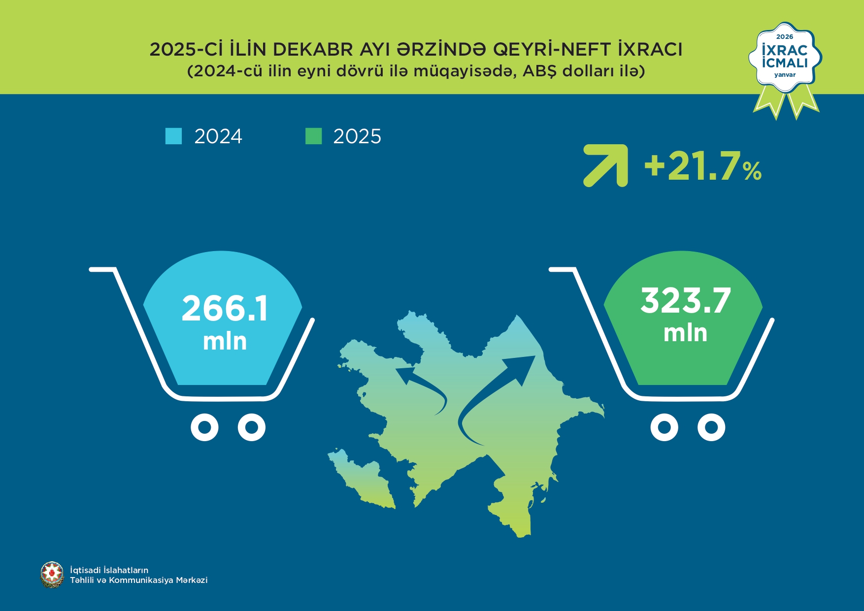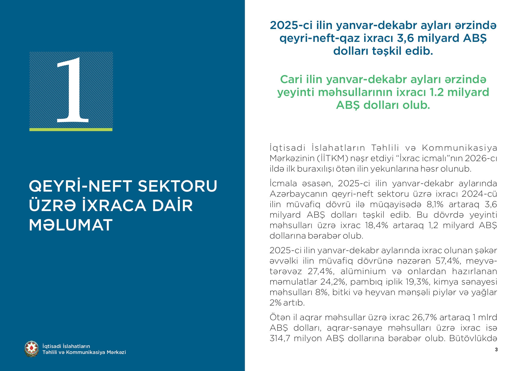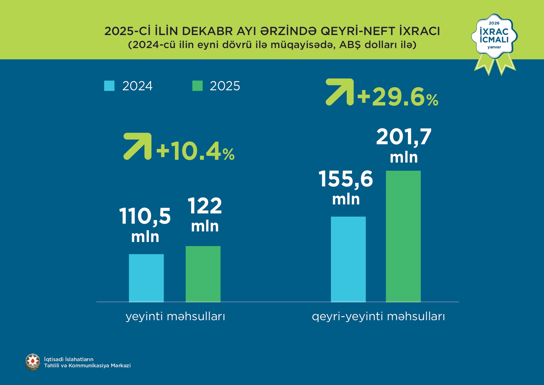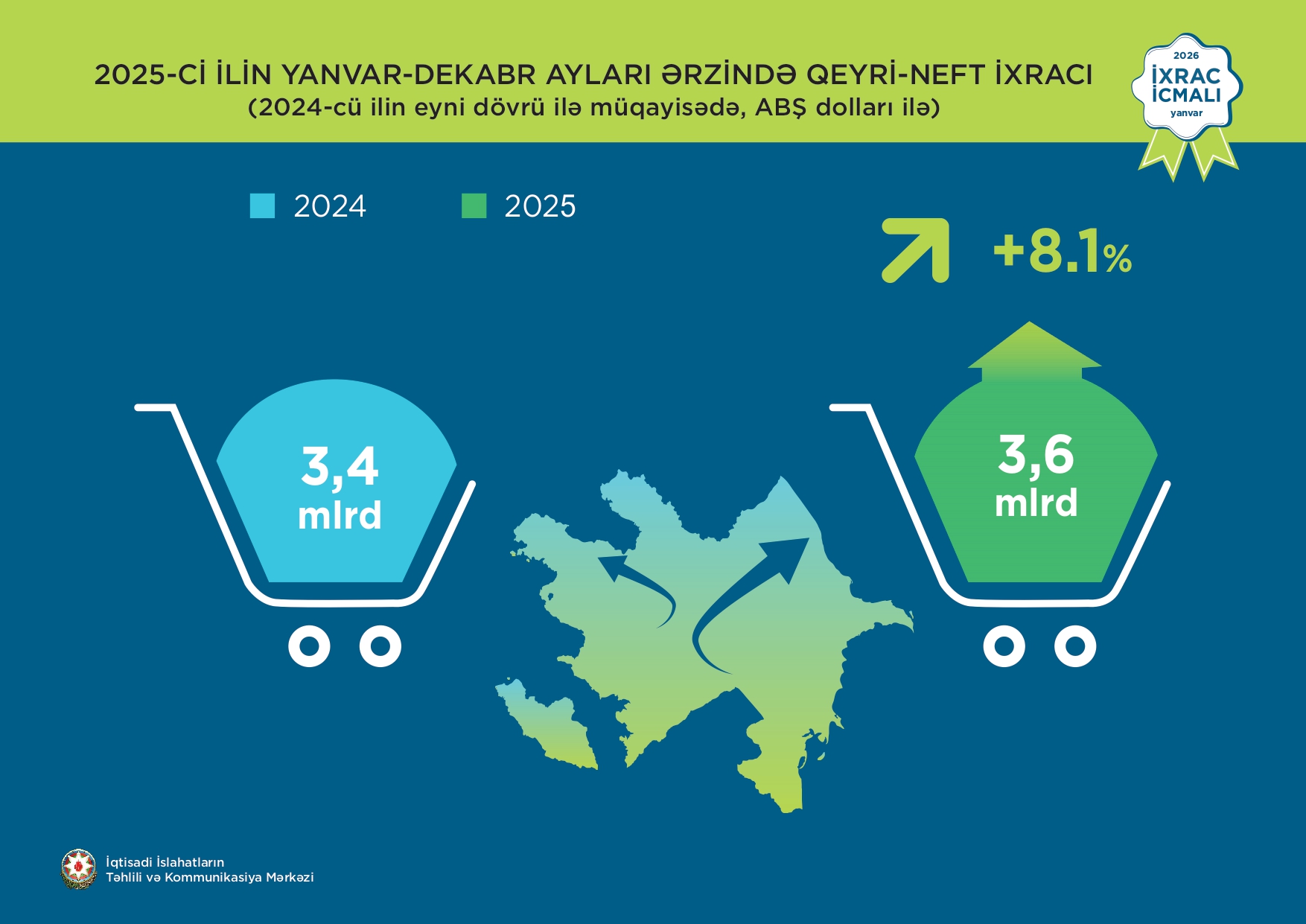 İcmala əsasən, 2025-ci ilin yanvar-dekabr aylarında Azərbaycanın qeyri-neft sektoru üzrə ixracı 2024-cü ilin müvafiq dövrü ilə müqayisədə 8,1% artaraq 3,6 milyard ABŞ dolları təşkil edib. Bu dövrdə yeyinti məhsulları üzrə ixrac 18,4% artaraq 1,2 milyard ABŞ dollarına bərabər olub.