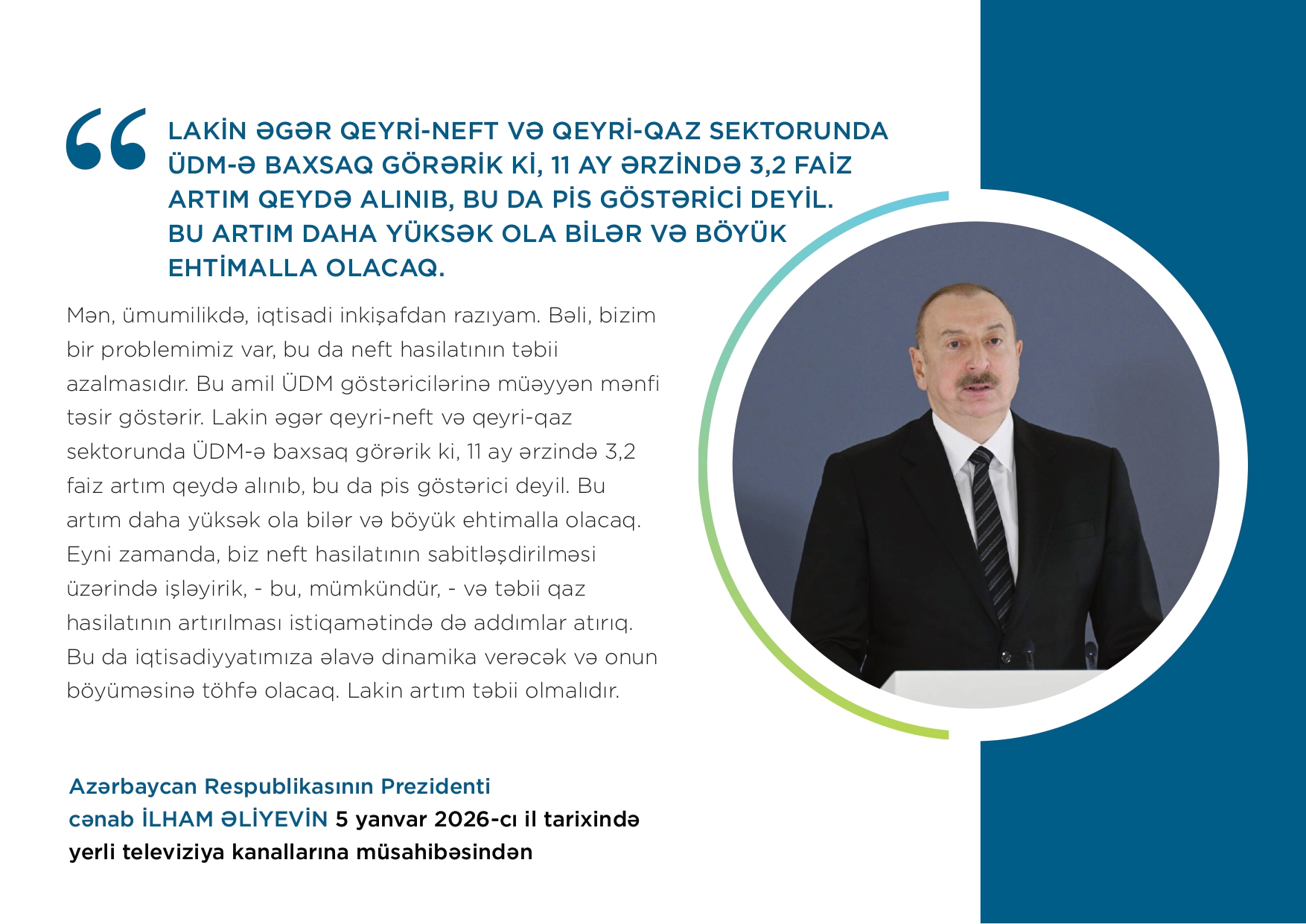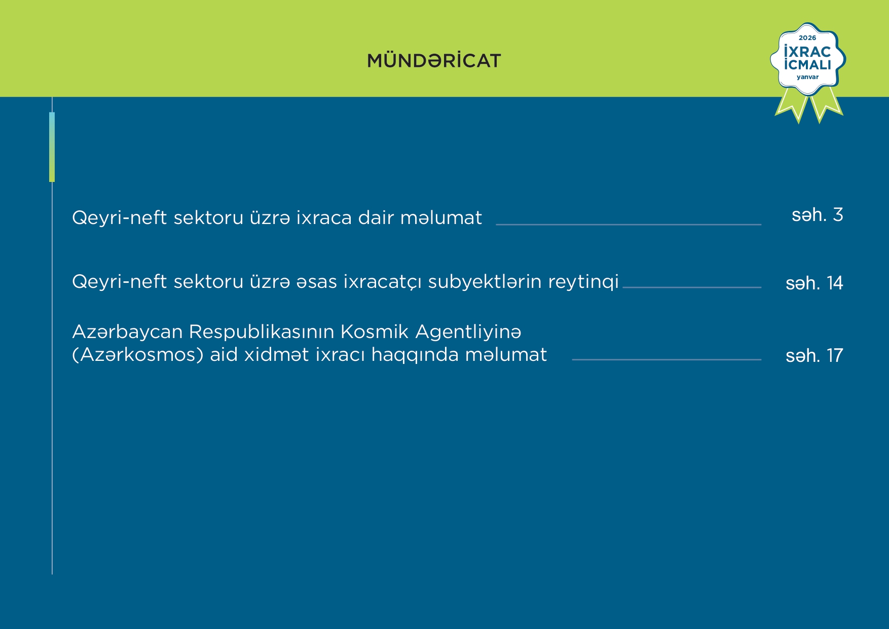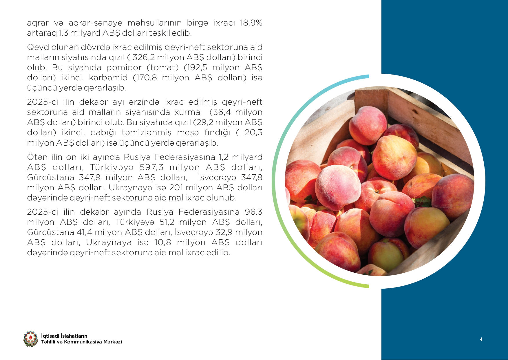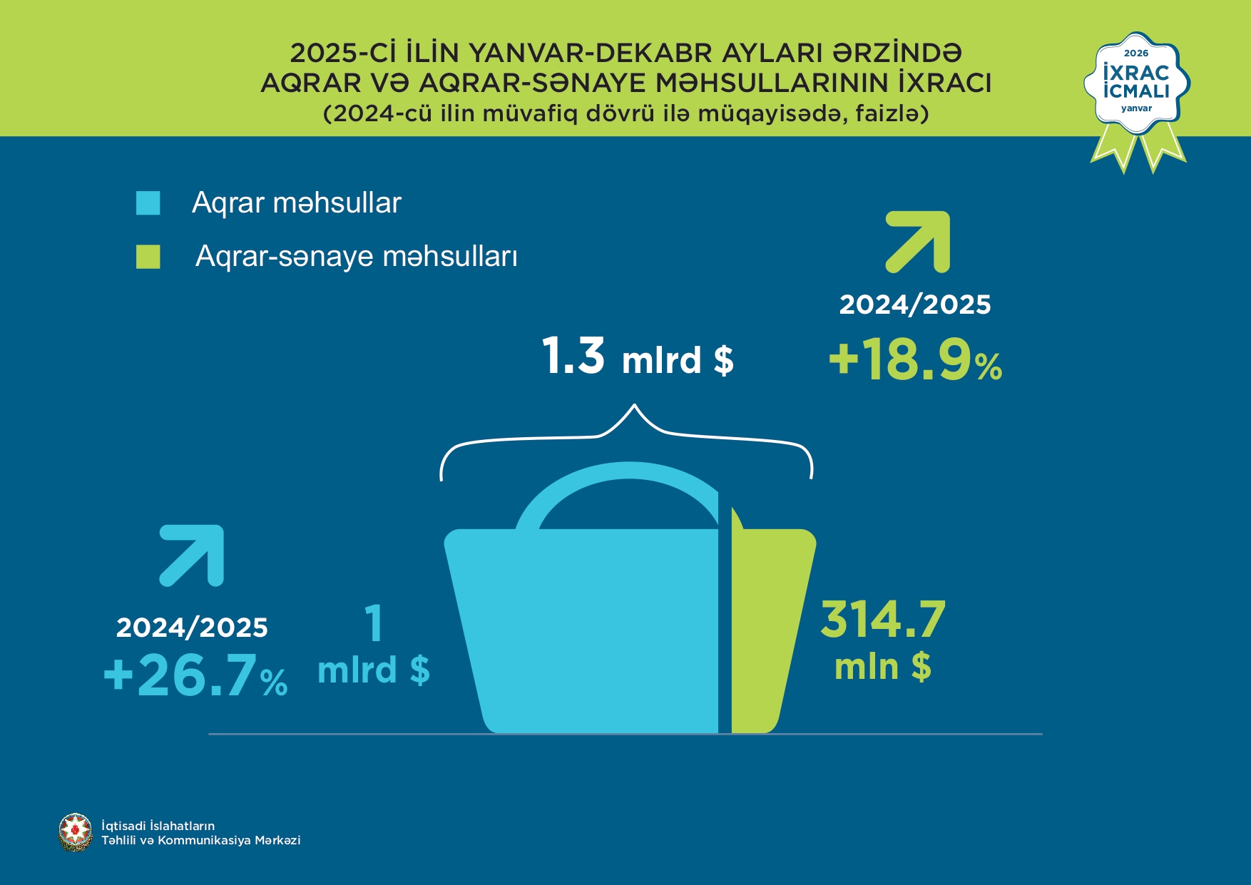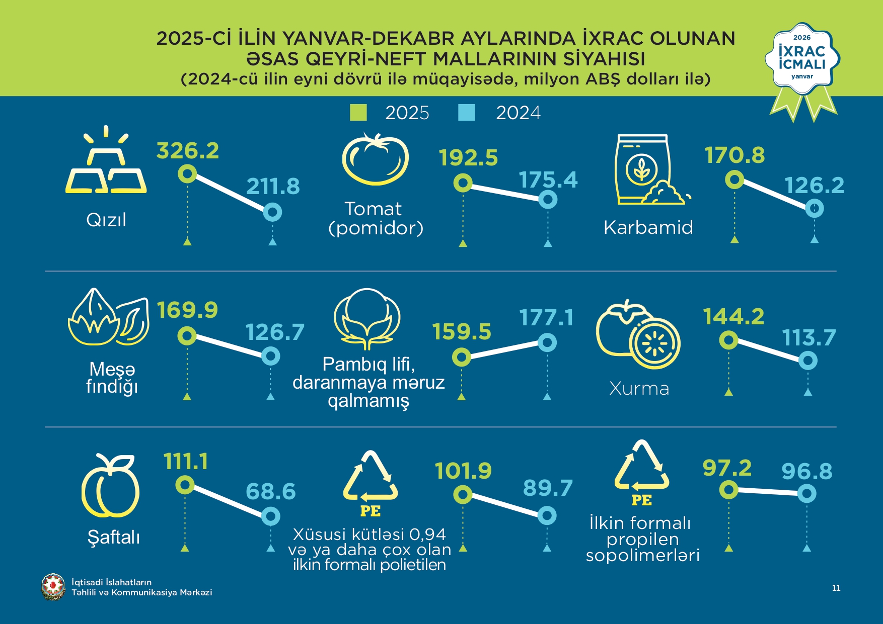 İcmala əsasən, 2025-ci ilin yanvar-dekabr aylarında Azərbaycanın qeyri-neft sektoru üzrə ixracı 2024-cü ilin müvafiq dövrü ilə müqayisədə 8,1% artaraq 3,6 milyard ABŞ dolları təşkil edib. Bu dövrdə yeyinti məhsulları üzrə ixrac 18,4% artaraq 1,2 milyard ABŞ dollarına bərabər olub.