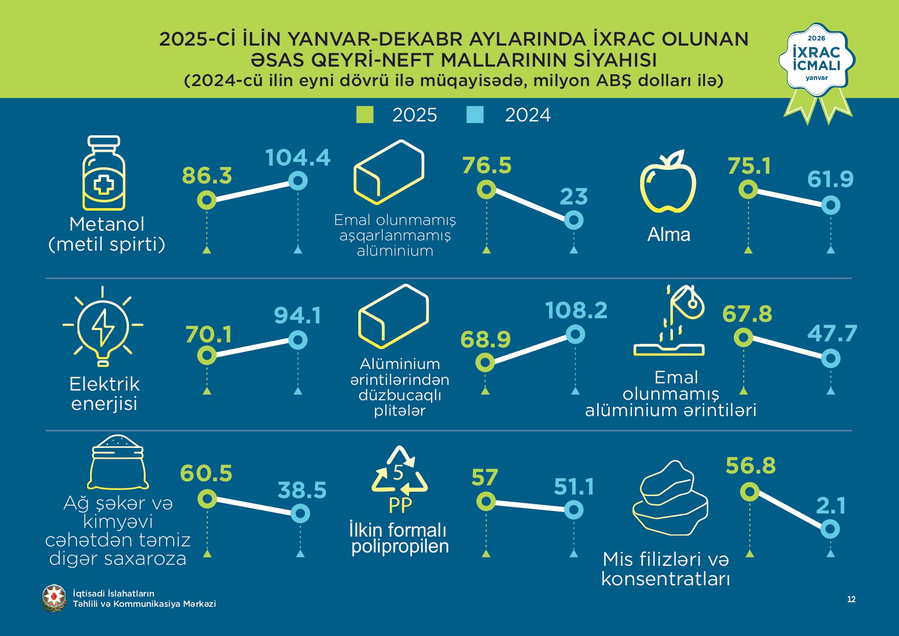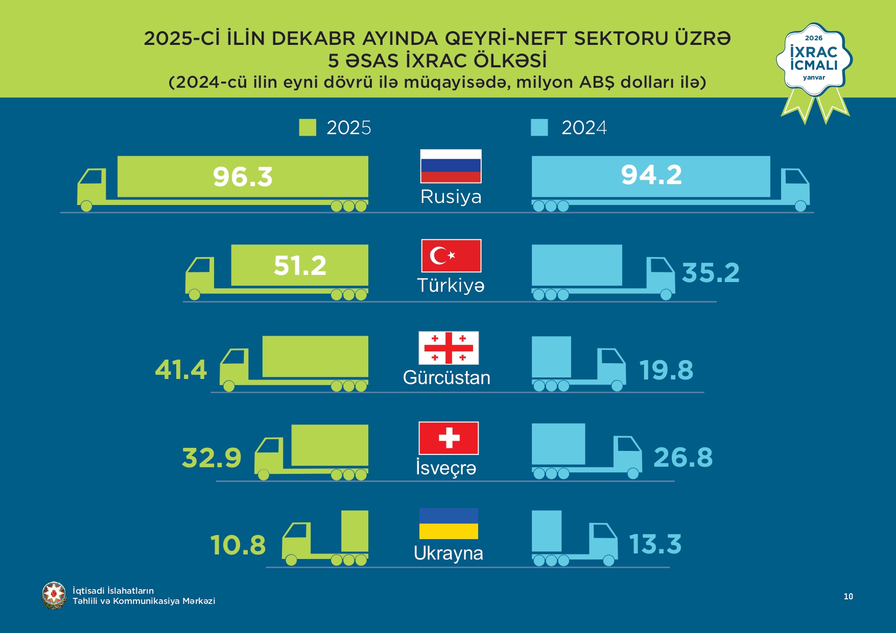 2025-ci ilin dekabr ayında Rusiya Federasiyasına 96,3 milyon ABŞ dolları, Türkiyəyə 51,2 milyon ABŞ dolları, Gürcüstana 41,4 milyon ABŞ dolları, İsveçrəyə 32,9 milyon ABŞ dolları, Ukraynaya isə 10,8 milyon ABŞ dolları dəyərində qeyri-neft sektoruna aid mal ixrac edilib.
