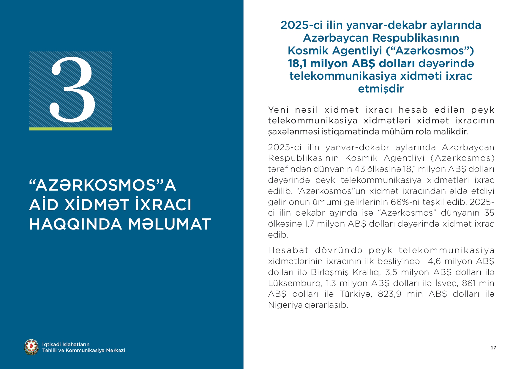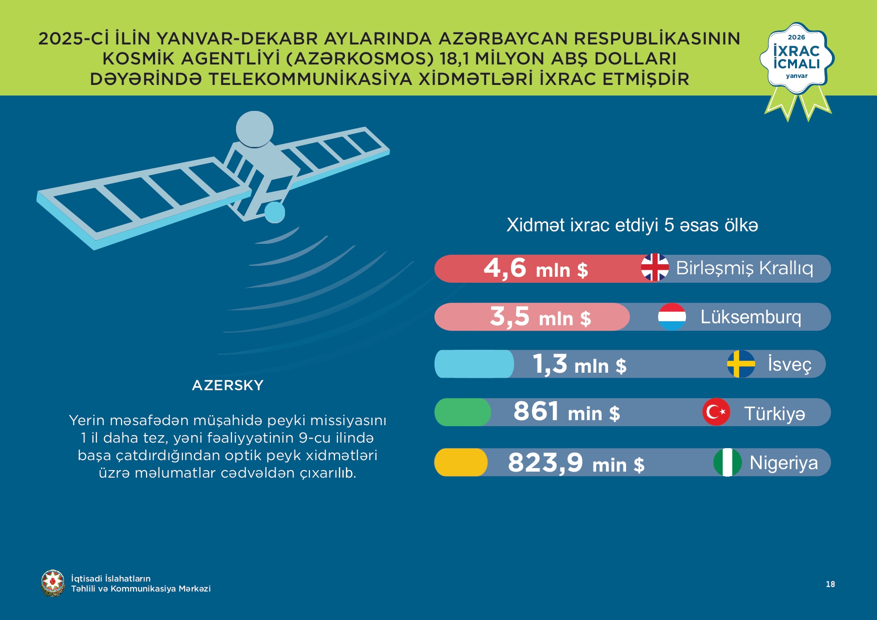 2025-ci ilin yanvar-dekabr aylarında Azərbaycan Respublikasının Kosmik Agentliyi (Azərkosmos) tərəfindən dünyanın 43 ölkəsinə 18,1 milyon ABŞ dolları dəyərində peyk telekommunikasiya xidmətləri ixrac edilib. “Azərkosmos”un xidmət ixracından əldə etdiyi gəlir onun ümumi gəlirlərinin 66%-ni təşkil edib. 2025-ci ilin dekabr ayında isə “Azərkosmos” dünyanın 35 ölkəsinə 1,7 milyon ABŞ dolları dəyərində xidmət ixrac edib.