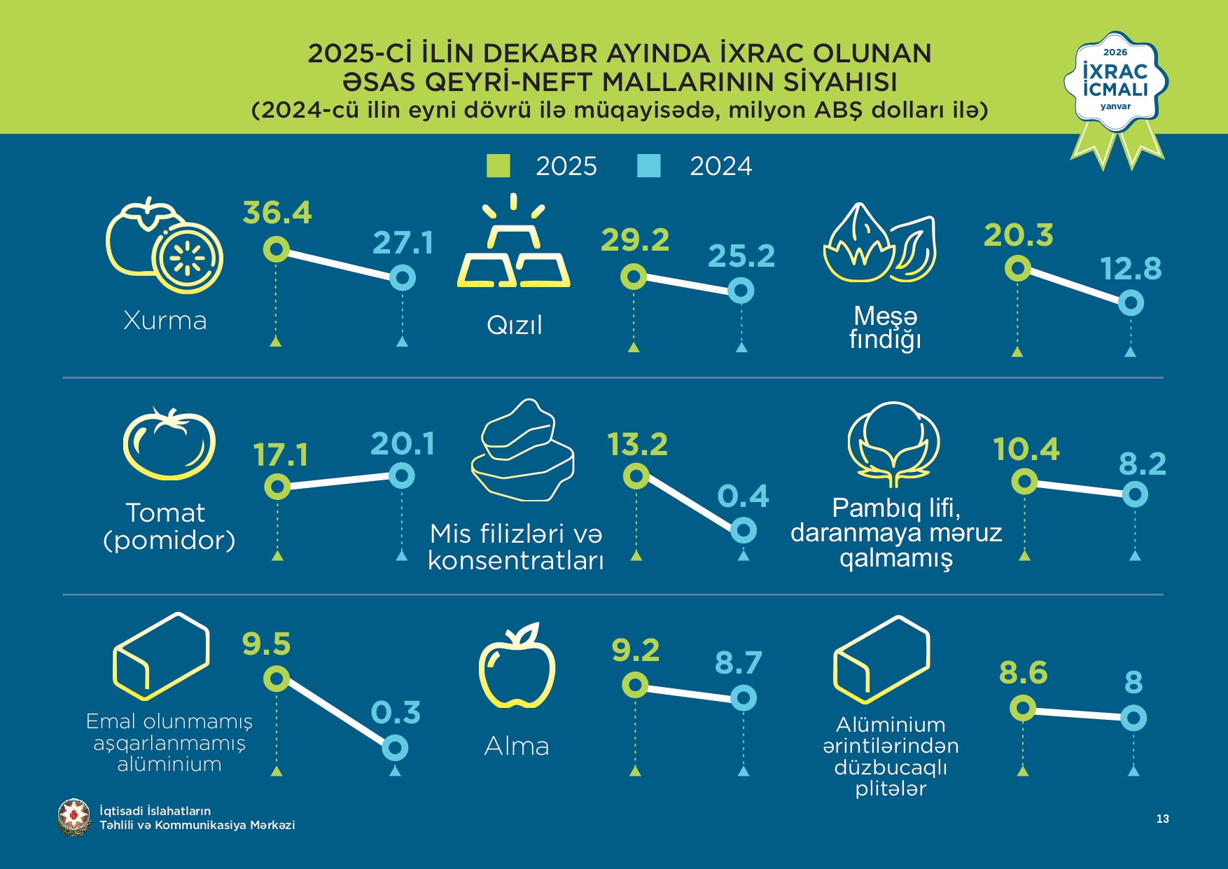 2025-ci ilin dekabr ayı ərzində ixrac edilmiş qeyri-neft sektoruna aid malların siyahısında xurma (36,4 milyon ABŞ dolları) birinci olub. Bu siyahıda qızıl (29,2 milyon ABŞ dolları) ikinci, qabığı təmizlənmiş meşə fındığı ( 20,3 milyon ABŞ dolları) isə üçüncü yerdə qərarlaşıb.