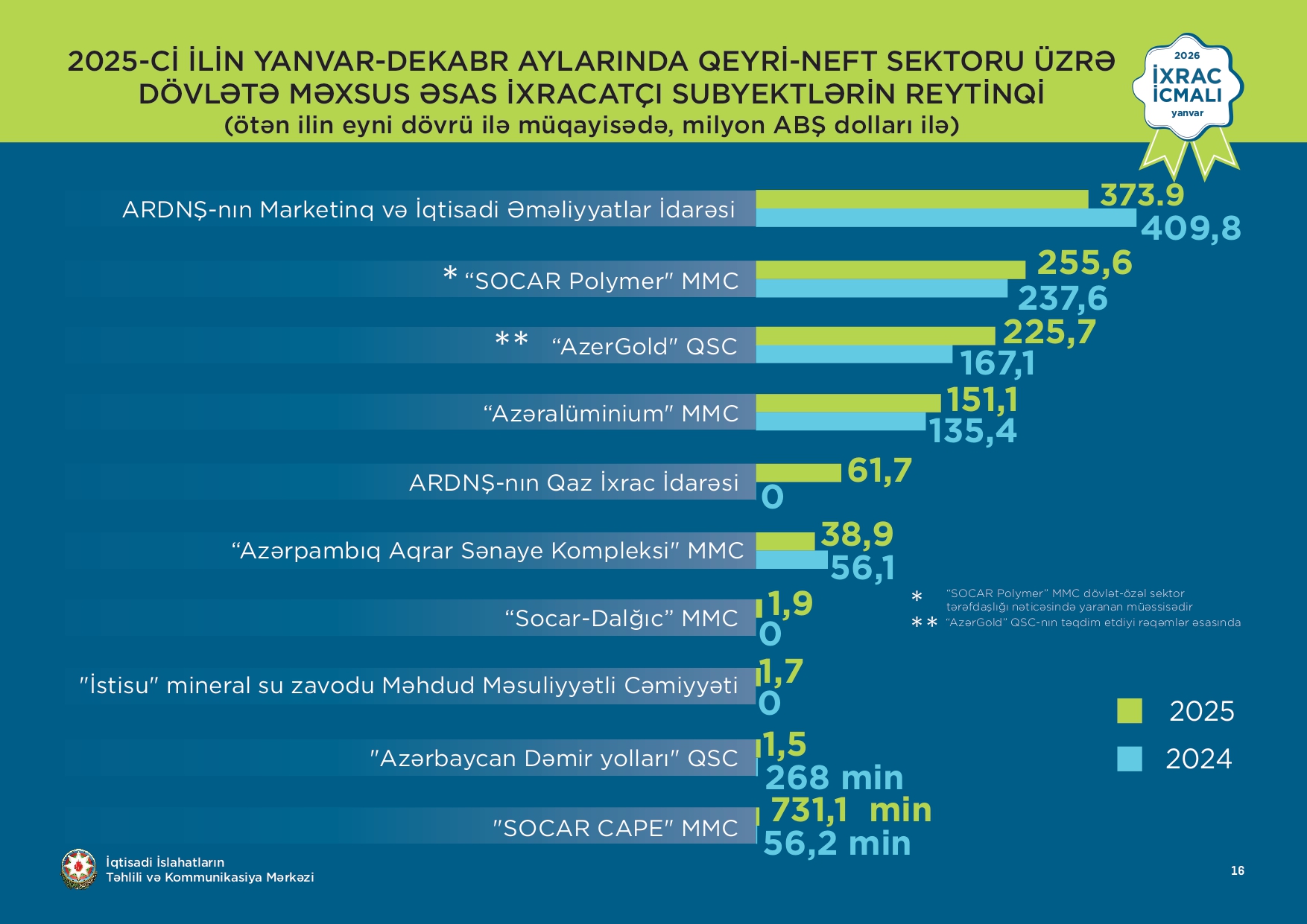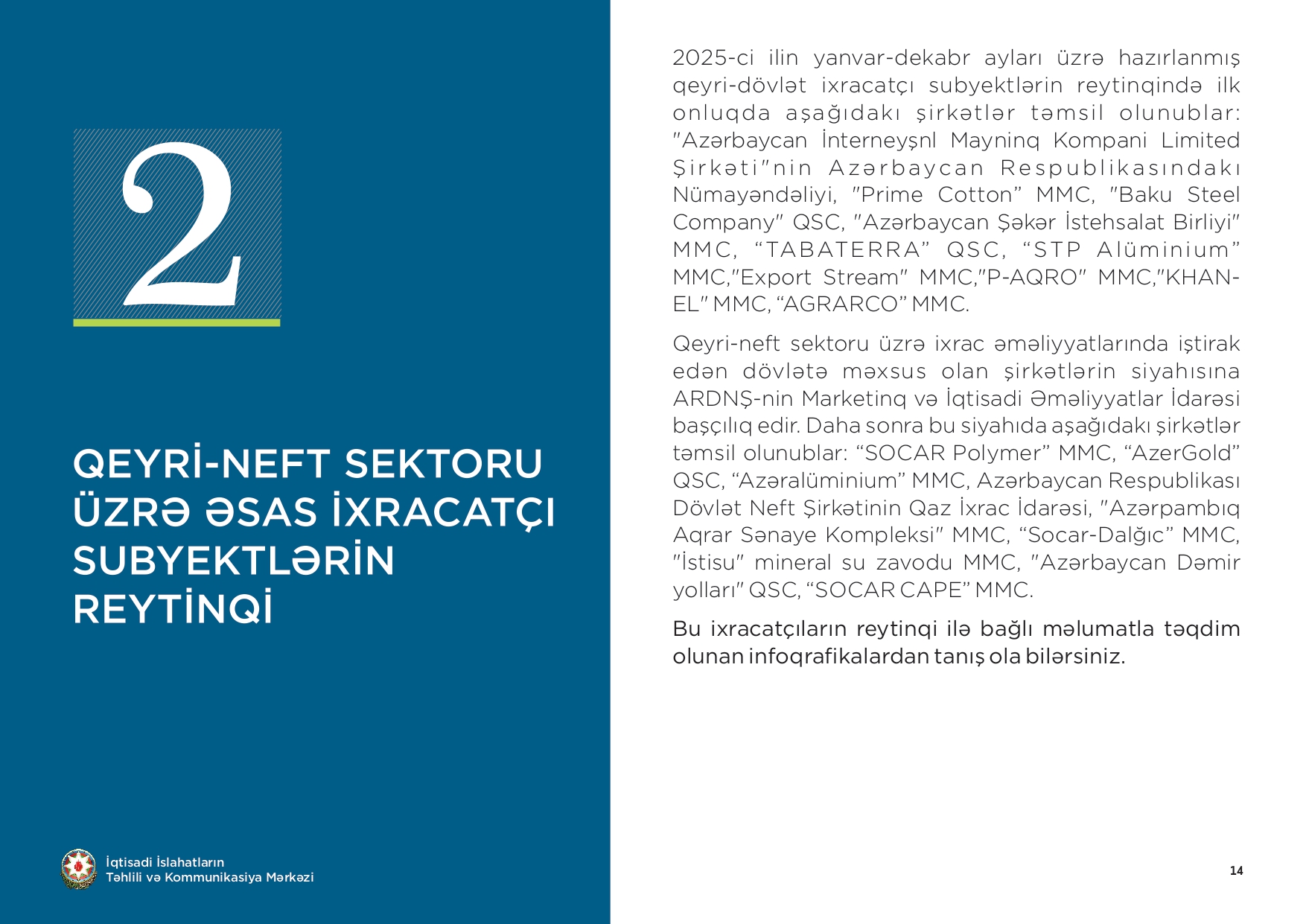 2025-ci ilin yanvar-dekabr ayları üzrə hazırlanmış qeyri-dövlət ixracatçı subyektlərin reytinqində ilk onluqda aşağıdakı şirkətlər təmsil olunublar: "Azərbaycan İnterneyşnl Mayninq Kompani Limited Şirkəti"nin Azərbaycan Respublikasındakı Nümayəndəliyi, "Prime Cotton” MMC, "Baku Steel Company" QSC, "Azərbaycan Şəkər İstehsalat Birliyi" MMC, “TABATERRA” QSC, “STP Alüminium” MMC,"Export Stream" MMC,"P-AQRO" MMC,"KHAN-EL" MMC, “AGRARCO” MMC.