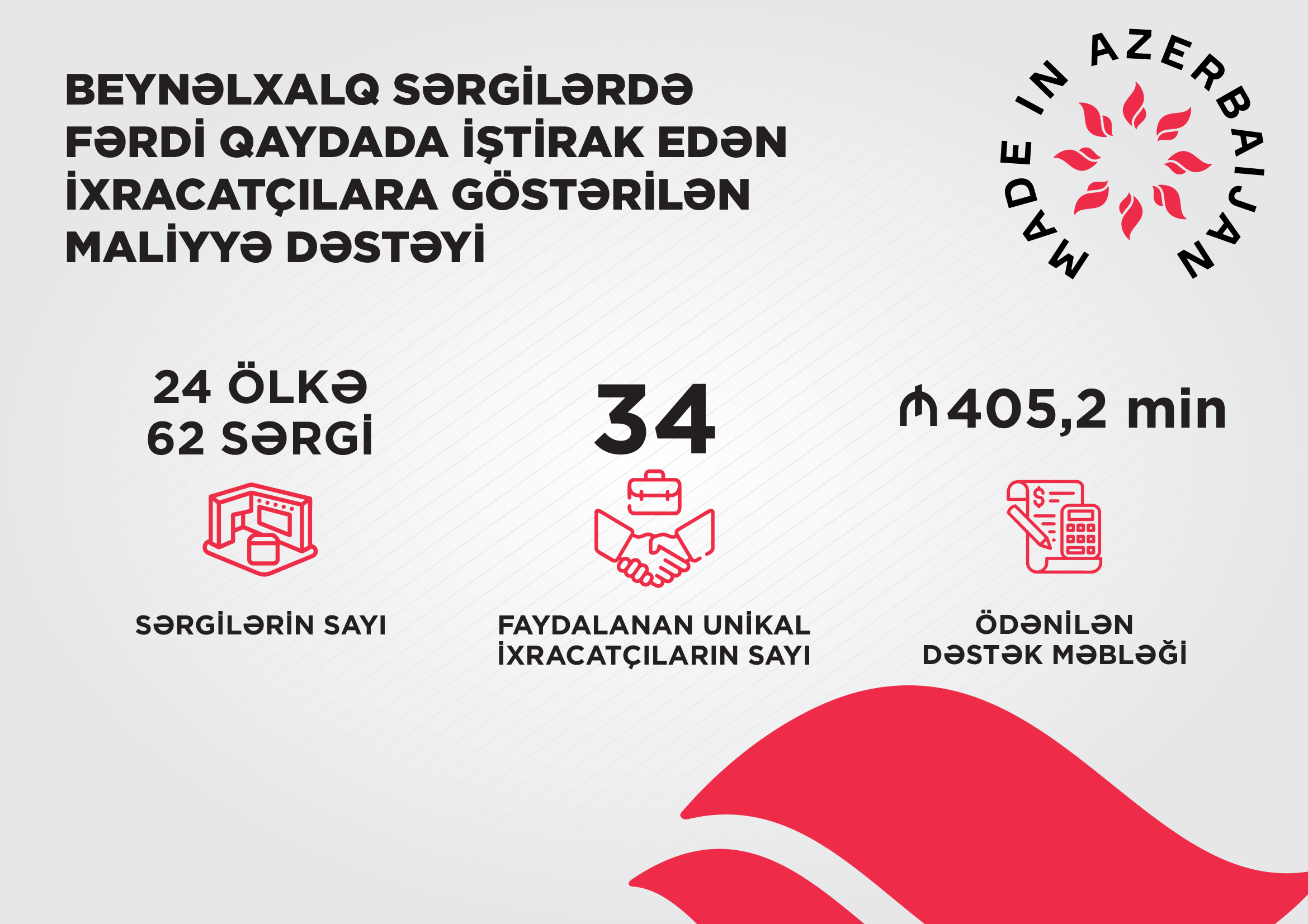 Beynəlxalq sərgilərdə fərdi qaydada iştirak mexanizmi çərçivəsində yerli ixracatçıların bazar coğrafiyasının genişlənməsinə yönəlmiş maliyyə dəstəyi davam etdirilib. Bu mexanizm nəticəsində 24 fərqli ölkədə keçirilmiş 62 beynəlxalq sərgidə iştiraka görə 34 unikal ixracatçıya 405 min manatdan çox dəstək göstərilib. Bununla da “Made in Azerbaijan” brendinin daha geniş coğrafiyada tanıdılması və məhsulların beynəlxalq bazarlarda təmsilçiliyinin artırılması üçün əlavə imkanlar yaradılıb.