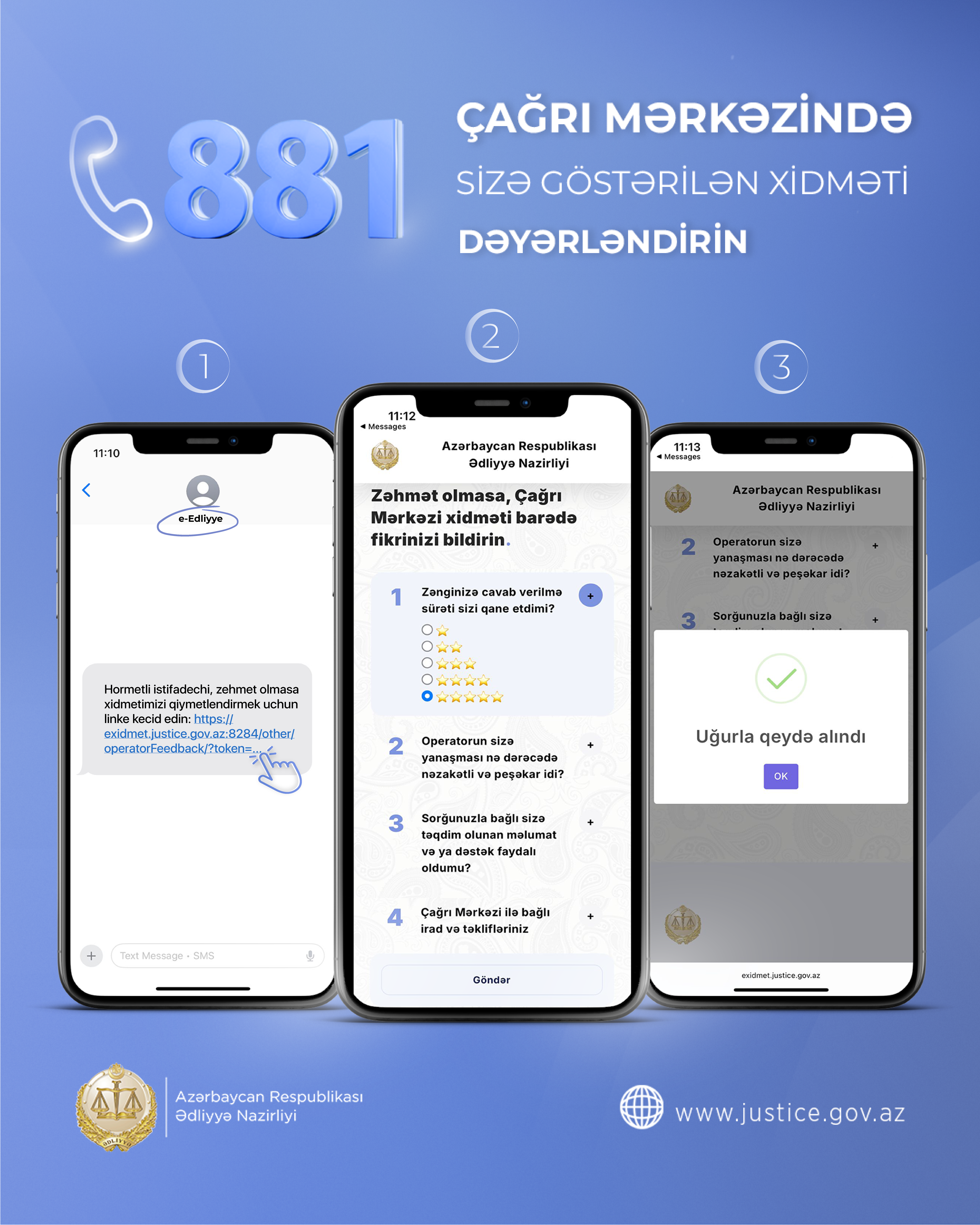 Finss.az - Ədliyyə Nazirliyinin “881” Çağrı Mərkəzi müraciətlərin obyektiv araşdırılması və cavablandırılması, fəaliyyətin təkmilləşdirilməsi üçün təhlillərin aparılması və vətəndaş məmnunluğunun artırılmasına xidmət edir.