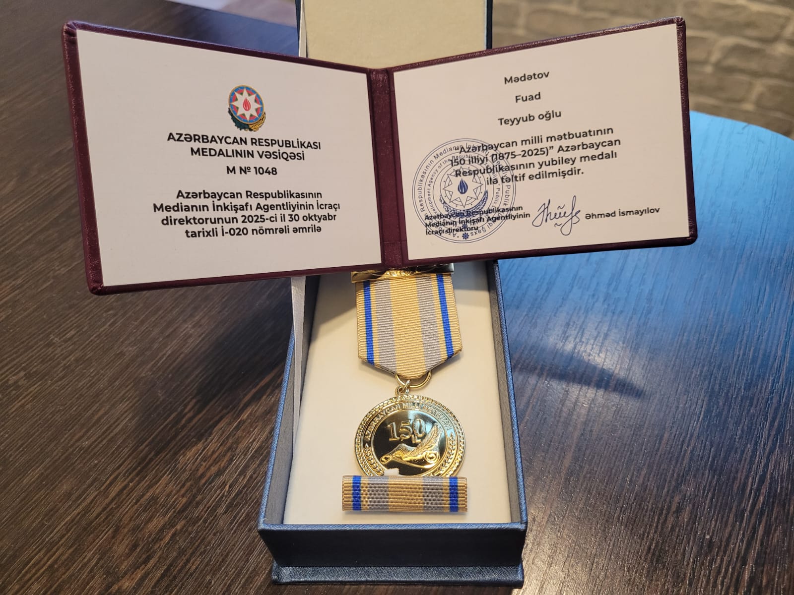 Fins.az saytının baş redaktoru Fuad Mədətov Prezident İlham Əliyevin Fərmanı ilə təsis edilmiş “Azərbaycan milli mətbuatının 150 illiyi (1875–2025)” Azərbaycan Respublikasının yubiley medalı ilə təltif edilib.