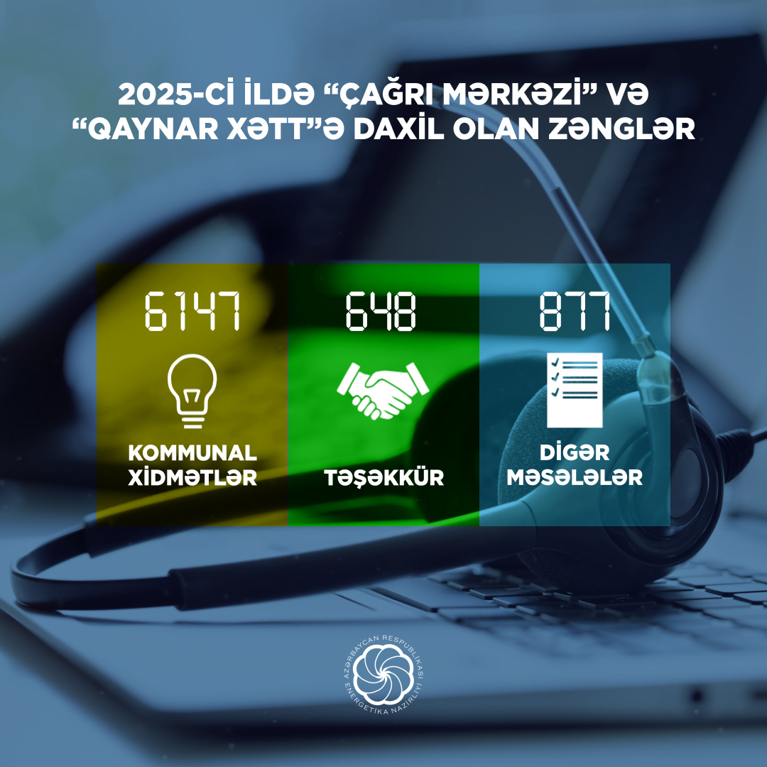Finss.az - 2025-ci il ərzində Energetika Nazirliyinin “Çağrı Mərkəzi” və “Qaynar xətt”i vasitəsilə 7672 zəng qəbul edilib.