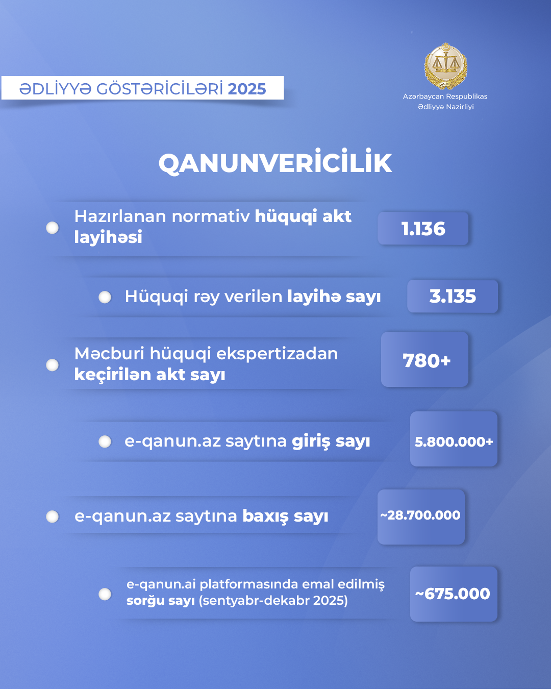 Bununla yanaşı, Ədliyyə Nazirliyi ilə Rəqəmsal İnkişaf və Nəqliyyat Nazirliyinin birgə əməkdaşlığı çərçivəsində istifadəyə verilmiş, Azərbaycanın hüquqi sənəd və qanunvericilik bazasında effektiv axtarış aparmağa imkan verən süni intellekt əsaslı və milli hüquqi bazaya əsaslanan “e-qanun.ai” platformasında 4 ay ərzində 675 minə yaxın sorğu emal edilib.