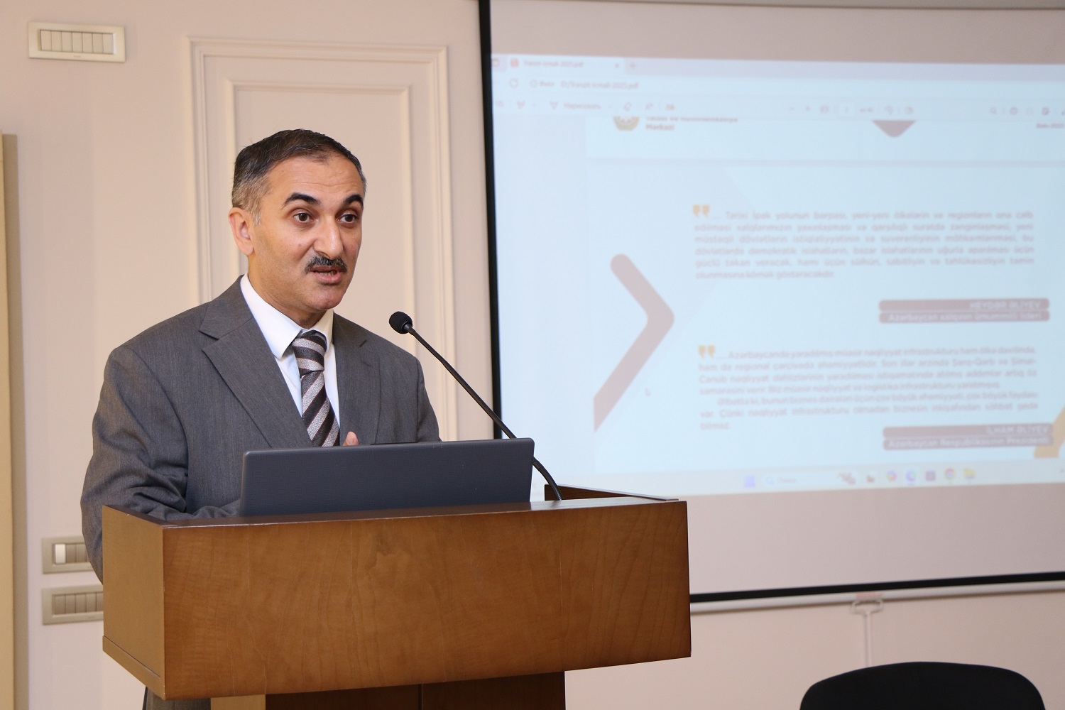 İİTKM-in nəqliyyat-logistika sahəsini əhatə edən daha bir nəşri - “Tranzit İcmalı”nın məsləhətçisi Rauf Ağamirzəyev isə çıxışında Orta Dəhlizin beynəlxalq logistika sistemində rolu, dəhliz boyunca tranzit xidmətlərinin optimallaşdırılması, rəqəmsal nəqliyyat modelləri və Azərbaycanın bu sahədə artan imkanları barədə məlumat verib.