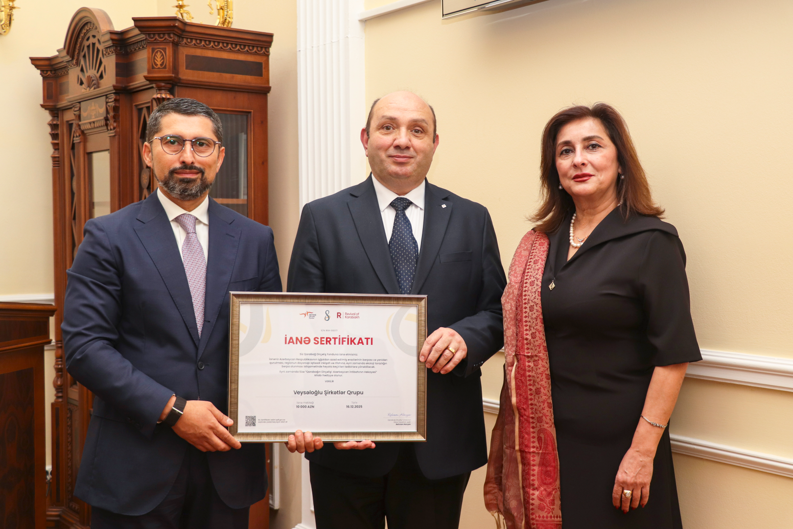 Tədbirin sonunda Qarabağın bərpası istiqamətində görülən işlərə dəstək olmaq məqsədilə Qarabağ Dirçəliş Fonduna 10.000 AZN ianə edərək “Qarabağın Dirçəlişi: Azərbaycan İntibahının Hekayəsi” kitabı əldə edən Veysəloğlu Şirkətlər Qrupuna Fondun adından “İanə sertifikatı” təqdim olunub.