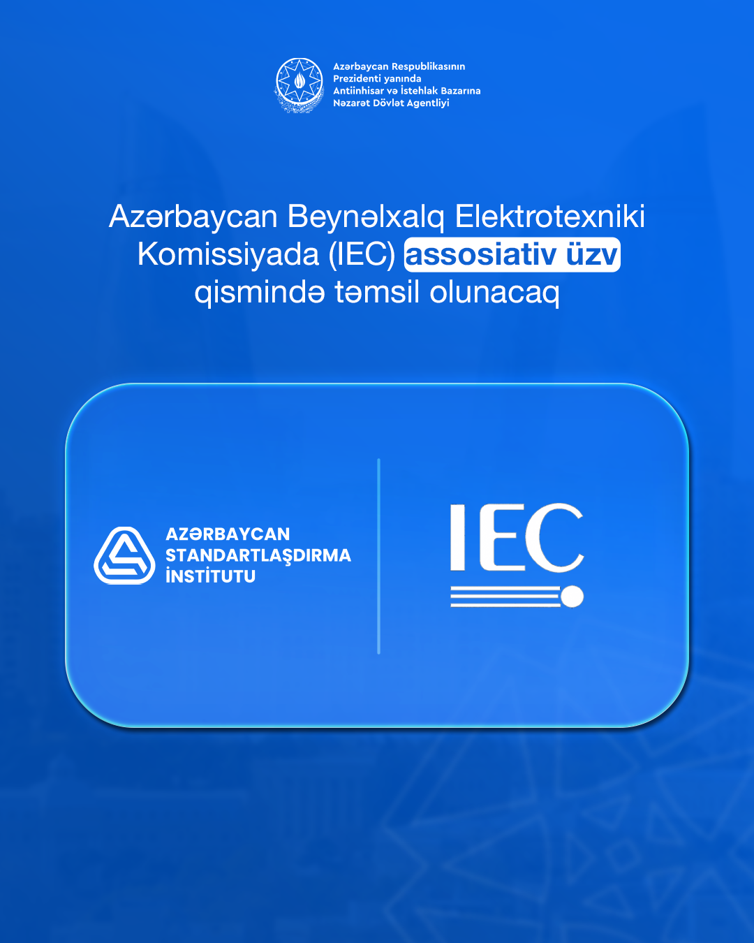 Azərbaycan Respublikasının Prezidenti yanında Antiinhisar və İstehlak Bazarına Nəzarət Dövlət Agentliyinin tabeliyində olan Azərbaycan Standartlaşdırma İnstitutu (AZSTAND) vasitəsilə ölkəmiz 1 yanvar 2026-cı il tarixindən Beynəlxalq Elektrotexniki Komissiyada (IEC) assosiativ üzv qismində təmsil olunacaq.