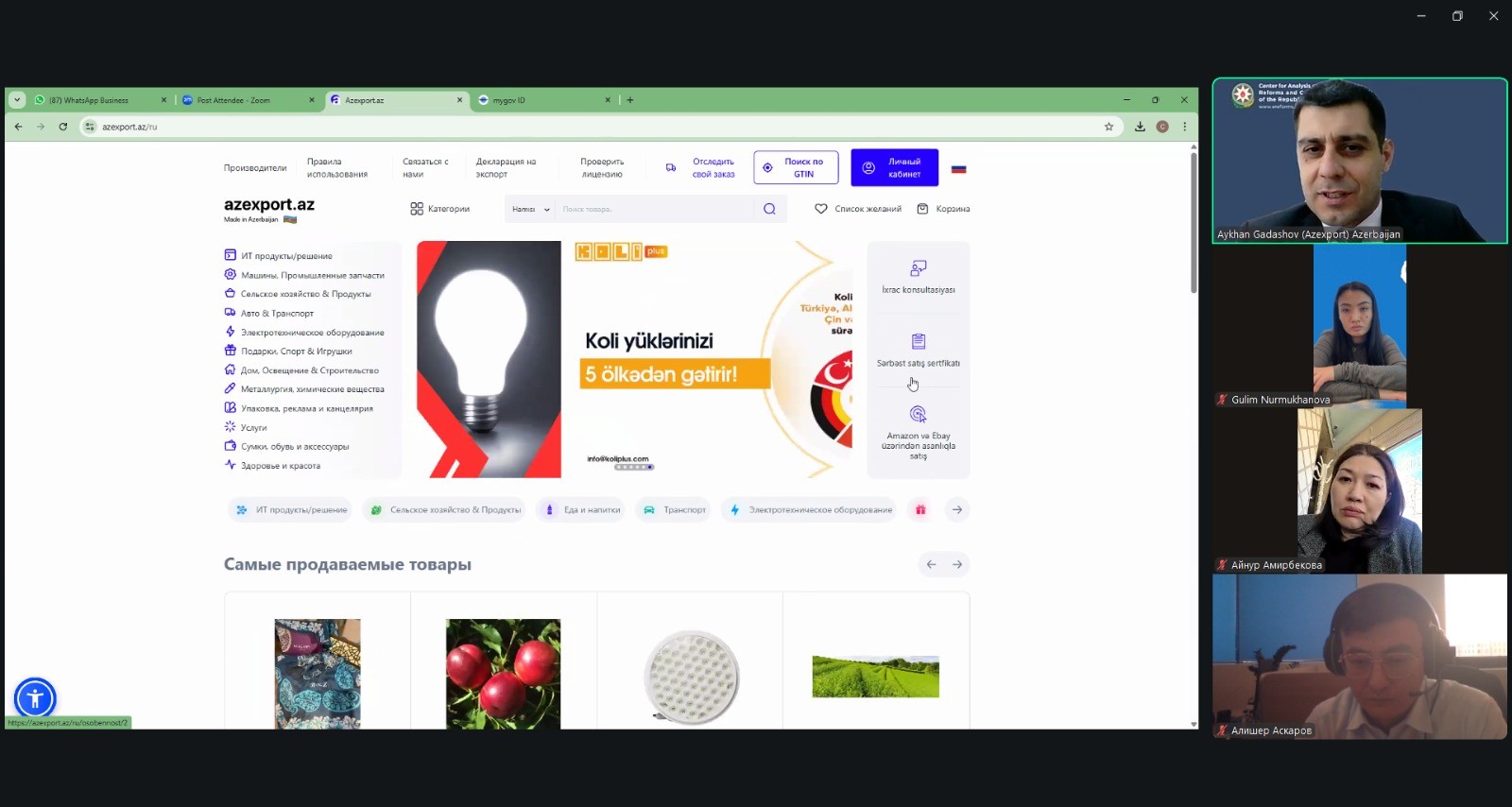 Finss.az - İqtisadi İslahatların Təhlili və Kommunikasiya Mərkəzinin (İİTKM) operatoru olduğu “Azexport.az” portalı ilə Qazaxıstanın Ticarət və İnteqrasiya Nazirliyinin “QazTrade” Ticarət Siyasətinin İnkişafı Mərkəzi arasında işçi görüş keçirilib. Görüşün əsas məqsədi Azərbaycanın elektron ixrac sahəsindəki uğurlu modelinin öyrənilməsi və bu təcrübənin Qazaxıstanda yaradılması planlaşdırılan analoji platformada tətbiqi imkanlarının müzakirəsi olub.