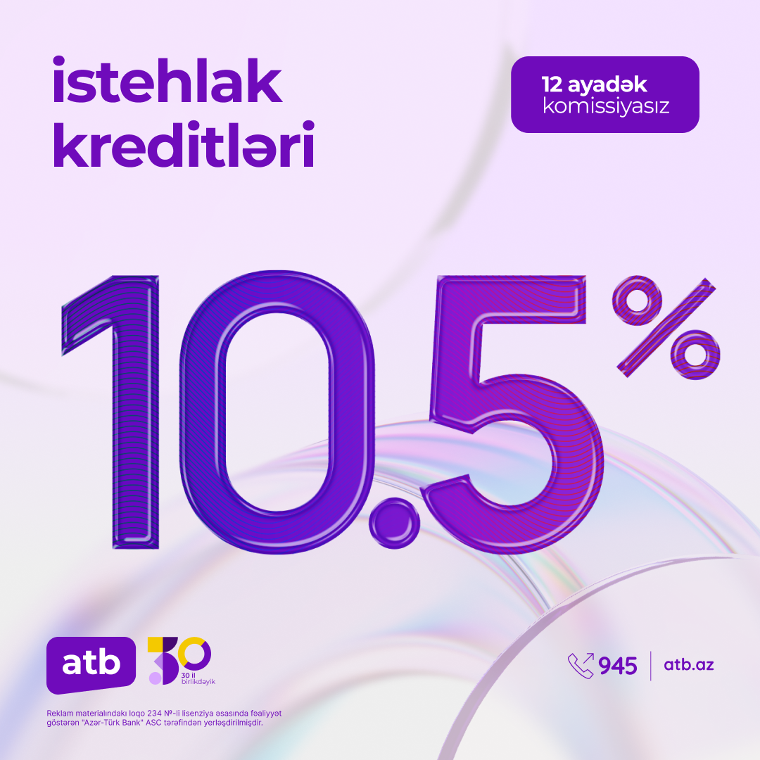 Finss.az - Dövlət bankı Azər Türk Bank tərəfindən bir il müddətinədək verilən istehlak kreditlərinin illik faiz dərəcəsi 10,5% səviyyəsindədir. Bu kreditlər üzrə xidmət haqqı 0%-dir.