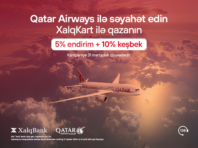 Xalq Bank Qatar Airways ilə davam edən endirim kampaniyasını daha da genişləndirərək müştərilər üçün əlavə üstünlüklər təqdim edir. Belə ki, XalqKart Petrol və XalqKart Cashback sahibləri 31.03.2026-cı il tarixinədək Qatar Airways-dən bütün istiqamətlərdə istənilən aviabilet alışı zamanı 10% keşbek və ya petrol bonusu qazanacaqlar. Kampaniya barədə daha ətraflı məlumatı buradan əldə edə bilərsiniz: //www.xalqbank.az/az/ferdi/kampaniyalar/xalqkart-la-qatar-airways-aviabiletleri-alisinda-10-kesbek-qazanin-az