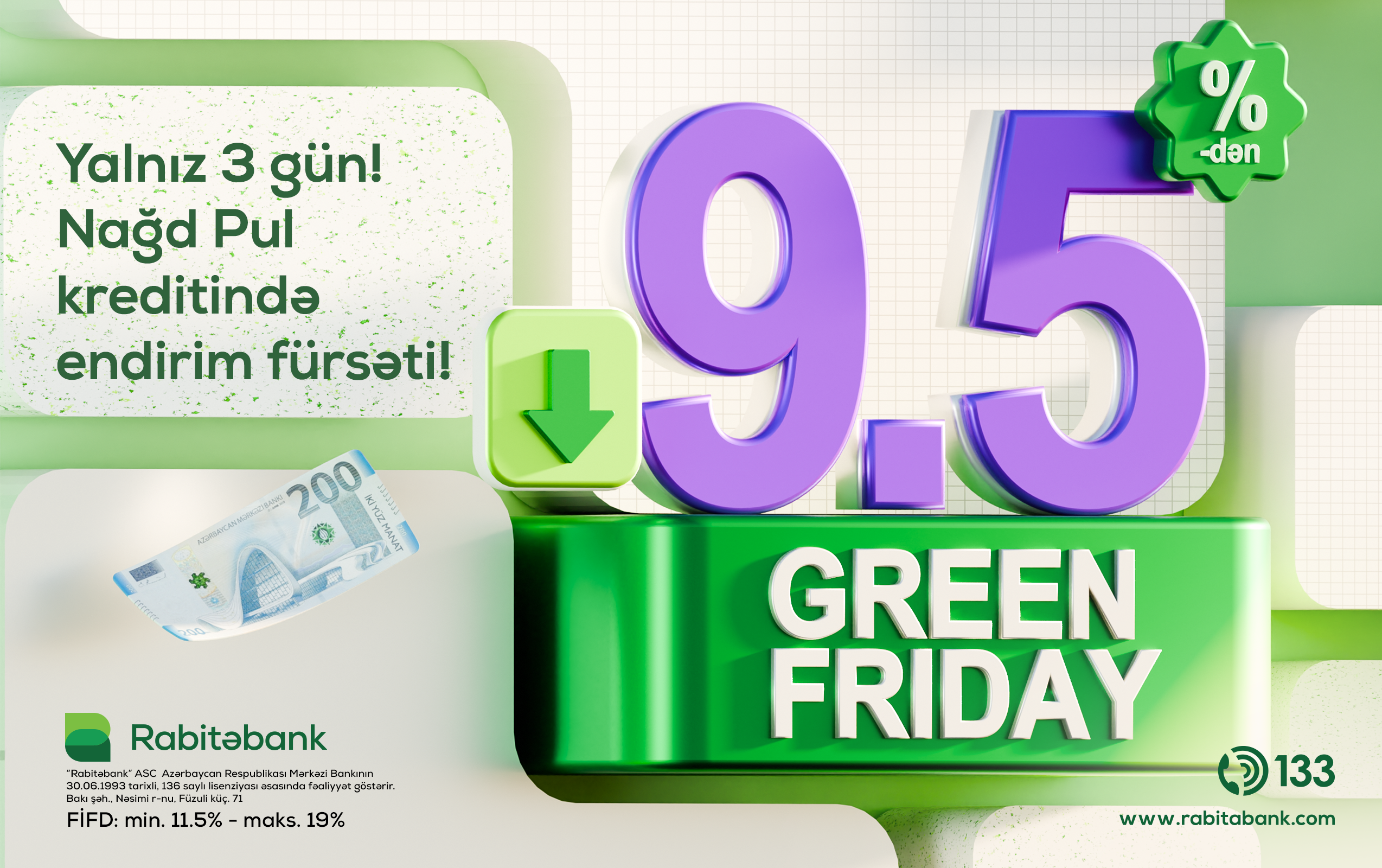 Belə ki, 26–28 noyabr tarixlərində Rabitəbankın “Green Friday” kampaniyası ilə komissiyasız və endirimli nağd pul krediti əldə etmək mümkündür. Kampaniya yalnız 3 gün davam edəcək və rəsmi gəliri olan bütün fiziki şəxslər üçün əlçatan olacaq.