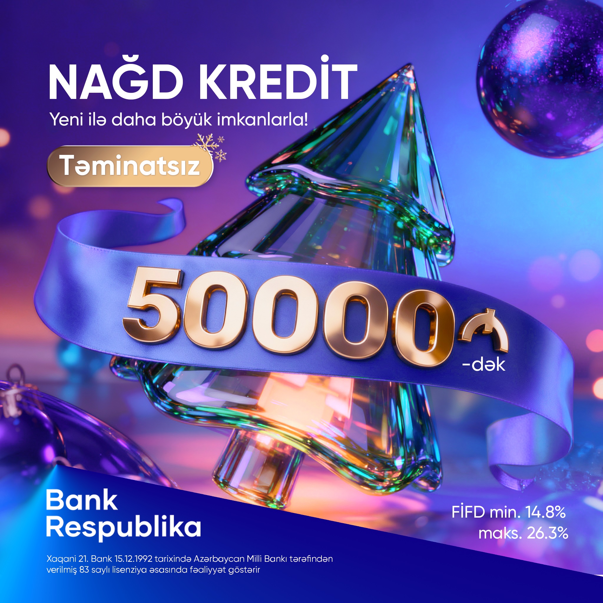 Elə indi Bank Respublikanın istənilən filialına və ya rəsmi saytında onlayn müraciət edin və 50.000 AZN-dək sərfəli nağd kreditləri təminatsız əldə etmək imkanı qazanın!
