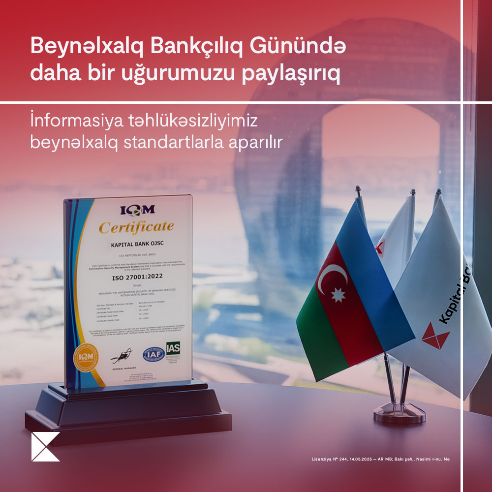 Kapital Bank informasiya təhlükəsizliyi idarəetmə sisteminin (İTİS) daha da gücləndirilməsini rəsmiləşdirərək, beynəlxalq miqyasda ən qabaqcıl standartlardan biri olan ISO/IEC 27001:2022 sertifikatı üzrə uyğunluğunu təsdiqləyib. Bu nailiyyət bankın rəqəmsal ekosisteminin və müştəri xidmətlərinin müasir kibertəhlükələrə qarşı ən yüksək səviyyədə müdafiə olunduğunun təkzibolunmaz göstəricisidir.