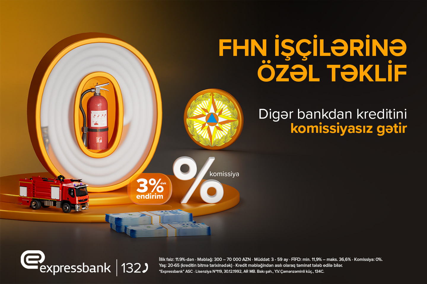 Expressbank Fövqəladə Hallar Nazirliyi işçilərinin peşə bayramının 20 illiyi münasibətilə bu sahədə çalışan şəxslərə nağd pul kreditini 0% komissiya ilə təklif edir. Kreditin müddəti 59 ayadəkdir.
