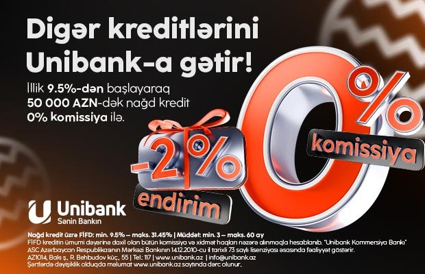 Yeni ildən kreditlərinizi daha sərfəli şərtlərlə ödəmək istəyirsinizsə, “Unibank”ın Yeni il kampaniyası sizə ünvanlanıb. Kreditlərinizi 0 % komissiya və üstəlik 2 % endirimlə bir ünvanda birləşdirmək üçün Unibank sizə əla fürsət yaradıb. Dekabrın sonunadək digər banklardakı kreditlərini “Unibank”a gətirən müştərilər, nağd kreditini komissiyasız rəsmiləşdirməklə yanaşı, illik faiz dərəcəsinə 2 % endirim əldə edir və ayda cəmi bir dəfə ödəniş etmək imkanı qazanırlar. İllik 9,5 faizdən başlayan nağd kreditlər 60 ayadək müddətə verilir. Kreditin maksimal məbləği 50 000 manatdır.