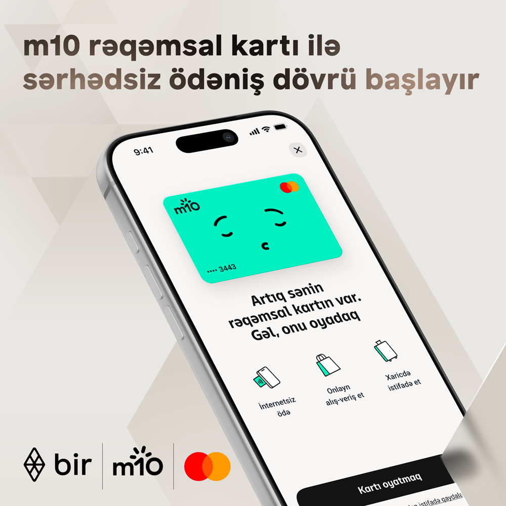 Müştərilərinə daim ən son rəqəmsal ödəniş həlləri təqdim edərək onların gündəlik həyatını asanlaşdıran Bir ekosistemi daha bir yenilik təqdim edir. Belə ki, ekosistemin tərkib hissəsi olan və təqdim olunduğu vaxtdan müştərilərə rəqəmsal əməliyyat imkanları yaradan m10 tətbiqdaxili rəqəmsal kartı ilə də vəsaitlərin istifadəsini beynəlxalq səviyyəyə qaldırır. Ödəniş sektorunun qlobal texnologiya şirkəti Mastercard ilə tərəfdaşlıq çərçivəsində təqdim olunan yeni rəqəmsal kart, m10 istifadəçilərinə dünyanın hər yerində rahat ödəniş imkanı tanıyır.