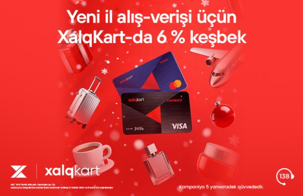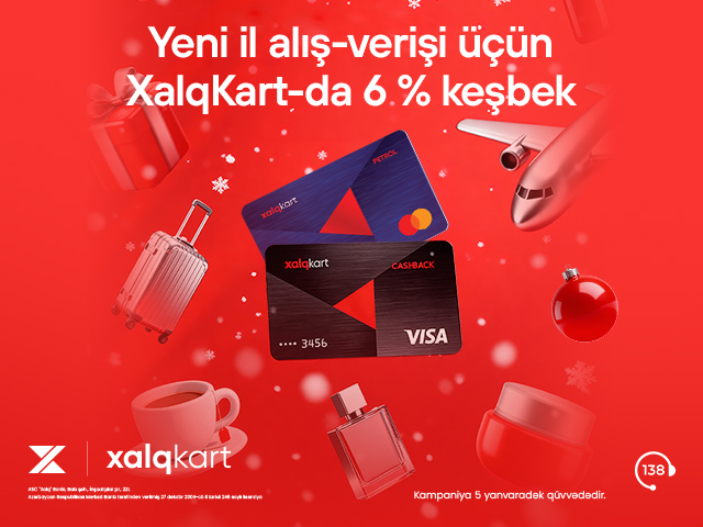 Yeni il alış-verişlərinizi XalqKart ilə edin, daha çox keşbek qazanın! Xalq Bankın XalqKart sahibləri üçün keçirdiyi kampaniya çərçivəsində 25 dekabr-5 yanvar tarixlərində seçilmiş kateqoriyalar üzrə ödənişlərə 6% keşbek/petrol təqdim olunacaq.