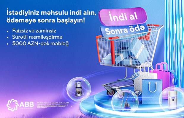 ABB yeni “İndi al, sonra ödə!” xidmətini müştərilərə təqdim edib. Bu, ABB-nin “İndi al, sonra ödə!” üzrə partnyoru olan mağazalarda elə yerindəcə kreditləşmə ilə məhsul alışına şərait yaradan yeni xidmət növüdür.