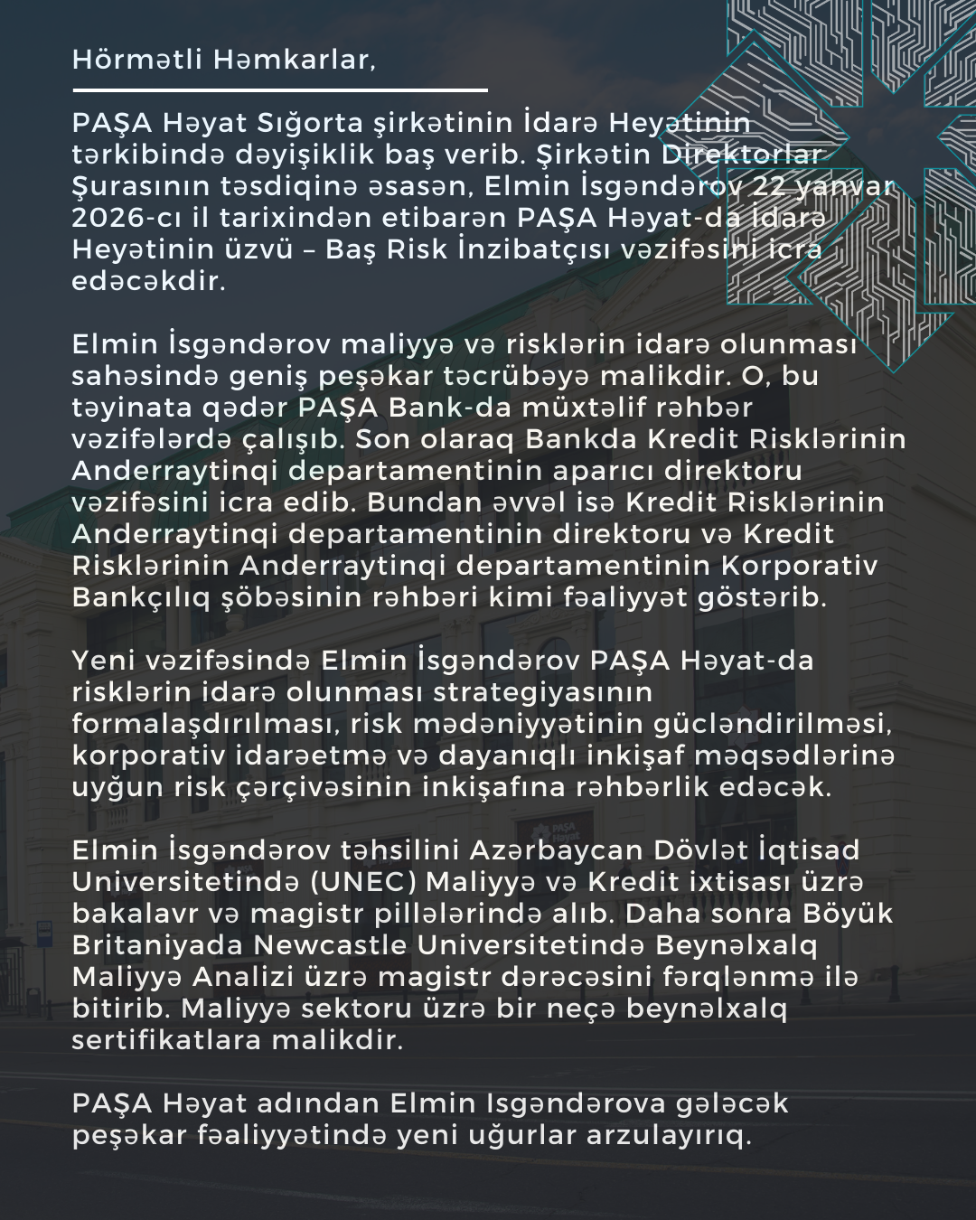 PAŞA Həyat Sığorta şirkətinin İdarə Heyətinin tərkibində dəyişiklik baş verib. Şirkətin Direktorlar Şurasının təsdiqinə əsasən, Elmin İsgəndərov 22 yanvar 2026-cı il tarixindən etibarən PAŞA Həyat-da İdarə Heyətinin üzvü – Baş Risk İnzibatçısı vəzifəsini icra edəcəkdir.