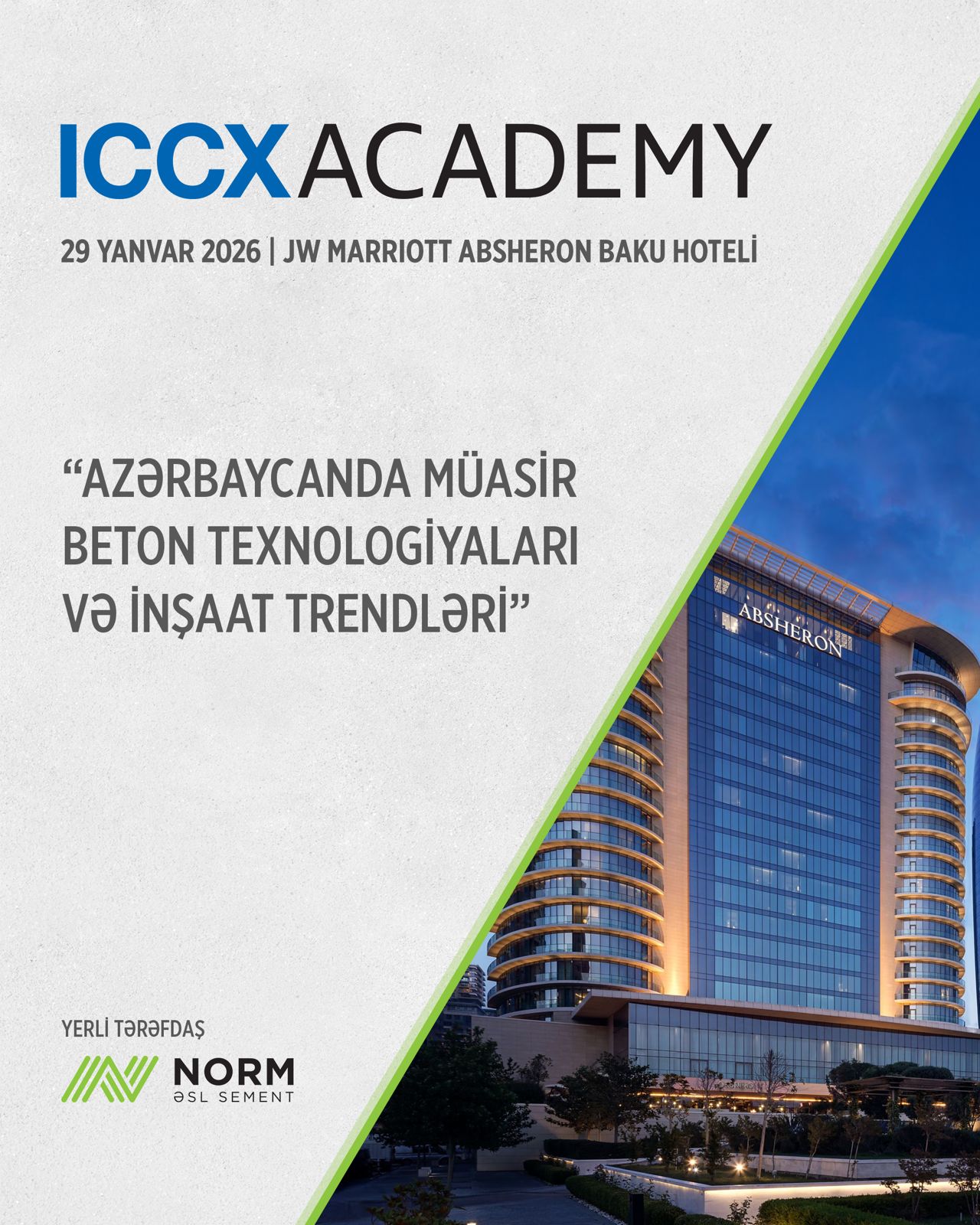 Bakıda beton sahəsinə həsr olunmuş beynəlxalq “ICCX Academy Baku” konfransı və sərgisi keçiriləcək. 29 yanvarda JW Marriott Absheron Baku Hotel-də təşkil olunacaq tədbirə Norm şirkəti ev sahibliyi edəcək. Bu platforma vasitəsilə Norm ölkənin inşaat sənayesinin peşəkarlarını bir araya gətirərək, yerli və beynəlxalq təcrübələrin qarşılıqlı paylaşılması üçün mühit yaradacaq.