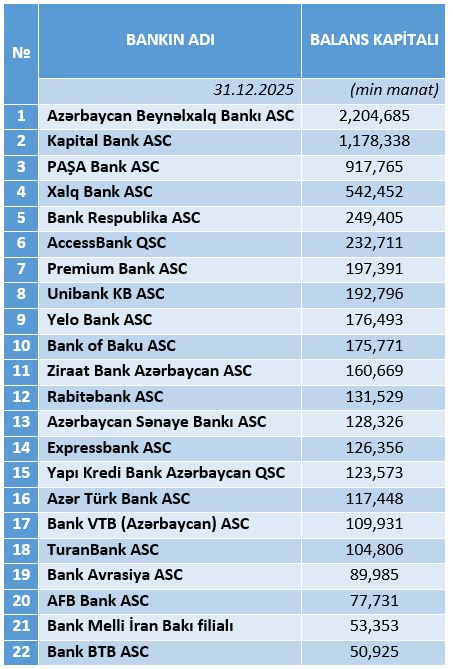Azərbaycanda fəaliyyət göstərən bankların 2025-ci ilin IV rübünün sonuna olan balans kapitalının həcmi üzrə cədvəli təqdim edirik: