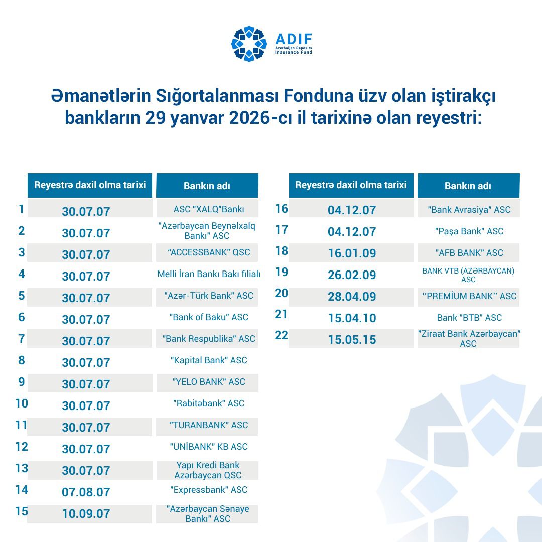Əmanətlərin Sığortalanması Fondu Azərbaycan Respublikasının “Əmanətlərin sığortalanması haqqında” Qanununun 30.1-ci maddəsinə əsasən, iştirakçı bankların 28 yanvar 2026-cı il tarixinə olan reyestrini ictimaiyyətin diqqətinə çatdırıb.
