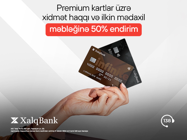 Xalq Bank müştərilərin premium kart üstünlüklərindən daha geniş yararlanması məqsədilə yeni kampaniya keçirir. Belə ki, 30 iyunadək Xalq Bankda aktiv əmanəti olan müştərilər Mastercard Black Edition və ya Visa Infinite ödəniş kartlarını birdəfəlik xidmət haqqına və ya kart hesabına ilkin mədaxil məbləğinə 50 % endirimlə əldə edə biləcəklər.