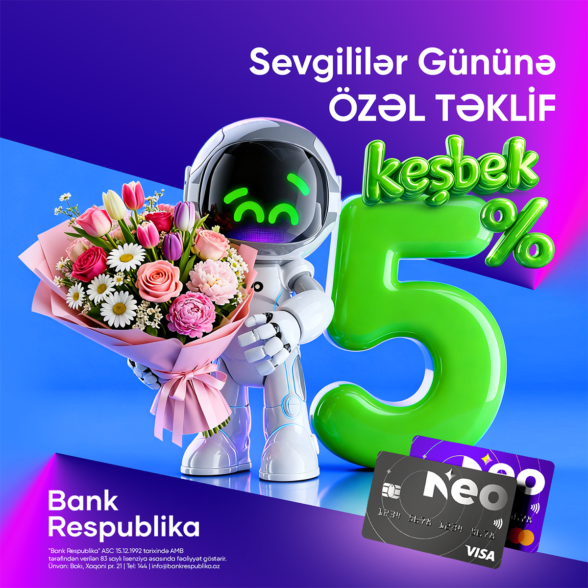 Bakı, 12 fevral 2026 — Müştərilərini hər zaman maraqlı və sərfəli kampaniyalarla sevindirən Bank Respublika, Sevgililər Günü ərəfəsində NeoKart sahibləri üçün xüsusi kampaniyaya start verir.