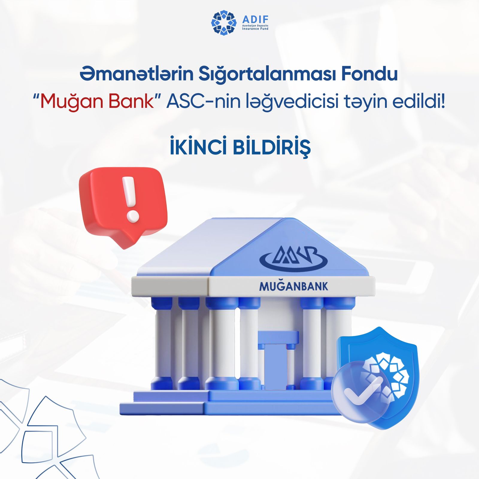 Azərbaycan Respublikası Mərkəzi Bankının İdarə Heyətinin 18 oktyabr 2023-cü il tarixli Qərarı ilə məcmu kapitalının miqdarının banklar üçün müəyyən edilmiş minimum miqdarından az olduğuna, məcmu kapitalının adekvatlıq əmsalının 3 faizdən az olmasına, cari fəaliyyətini etibarlı və prudensial qaydada həyata keçirmədiyinə, habelə bankın daxili idarəetmə və nəzarət prosedurları adekvat olmadığına görə “Banklar haqqında” Azərbaycan Respublikası Qanununun 16.1.6-cı, 16.1.7-ci, 16.1.9-cu, 16.1.18-ci, 57-ci və 61.1-ci maddələrinə əsasən “Muğan Bank” ASC-nin lisenziyası 19 oktyabr 2023-cü il tarixindən etibarən ləğv edilib, banka müvəqqəti inzibatçı təyin edilmiş və bankın müflisləşmə yolu ilə ləğv edilməsi barədə məhkəməyə müraciət olunub.