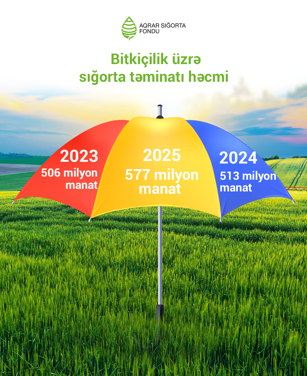 Əkin sahələrinin sığortalanmasından 13 milyon manat aqrar sığorta haqqı toplanılıb. Bunun müqabilində sığorta müqavilələri üzrə əkin sahələrinə 577 milyon manat sığorta təminatı verilib. Əkin sahələrinə verilən sığorta təminatının məbləği 2024-cü illə müqayisədə 64 milyon manat, 2023-cü illə müqayisədə isə 71 milyon manat artıb.