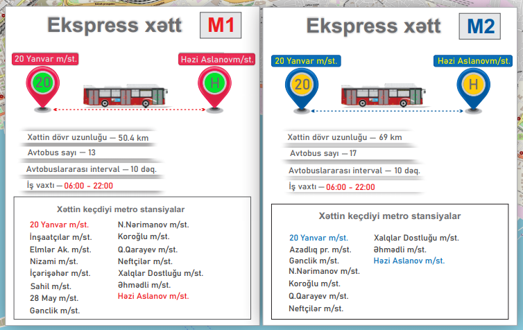 Bakı Nəqliyyat Agentliyindən Fins.az-a verilən məlumata görə, M1 və M2 ekspress marşrut xətləri avtobuslar 06:00-22:00 arası fəaliyyət göstərəcək. Ekspress xətlər üzrə avtobusların yalnız metro stansiyaların çıxışlarında olan dayanacaq məntəqələrində dayanacaq.