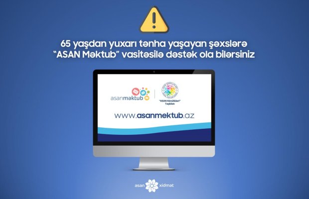Azərbaycan Respublikasının Nazirlər Kabineti yanında Operativ Qərargah tərəfindən elan olunmuş xüsusi karantin rejimində 65 yaşdan yuxarı tənha yaşayan insanların zəruri ehtiyacları ASAN könullüləri tərəfindən toplanaraq www.asanmektub.az saytına yerləşdiriləcək.
