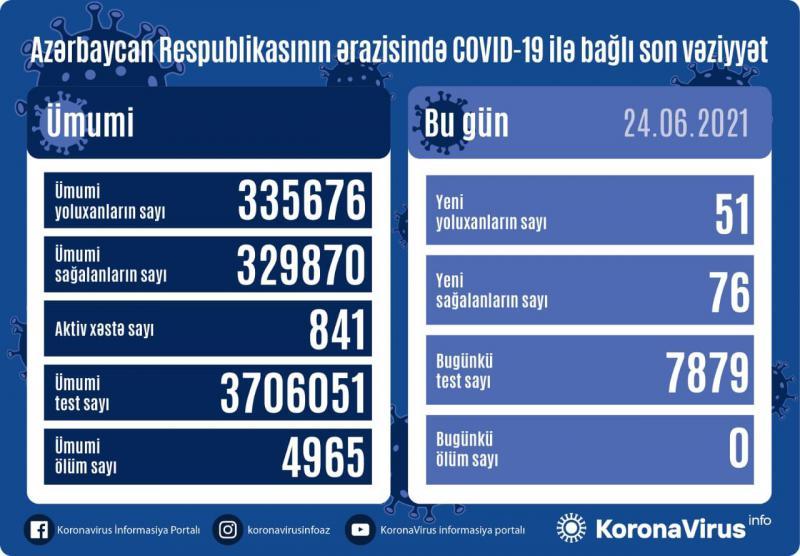 Azərbaycanda koronavirus (COVID-19) infeksiyasına 51 yeni yoluxma faktı qeydə alınıb, 76 nəfər müalicə olunaraq sağalıb.