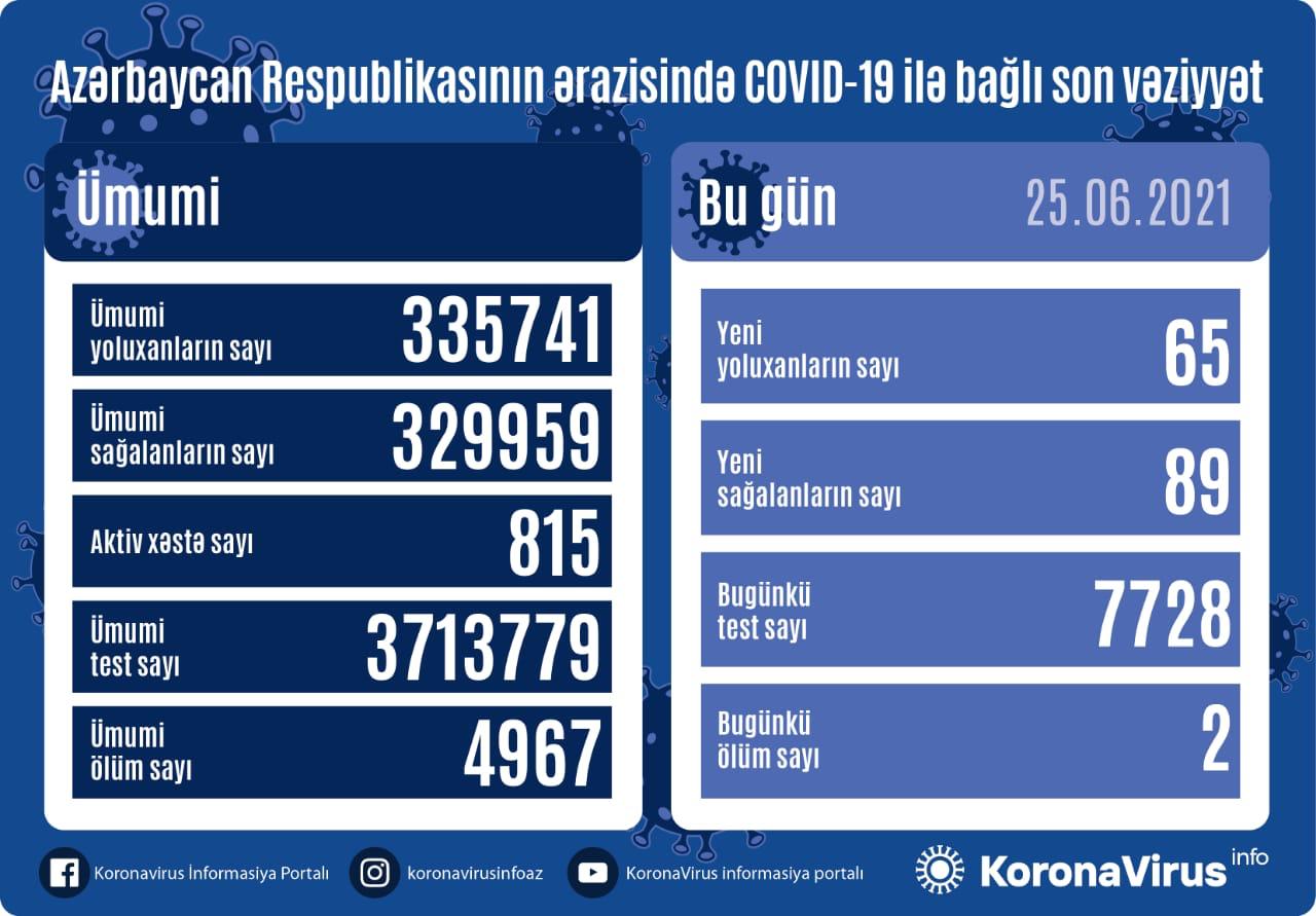 Azərbaycanda bu gün koronavirus infeksiyasına 65 yeni yoluxma faktı qeydə alınıb, 89 nəfər müalicə olunaraq sağalıb və evə buraxılıb.